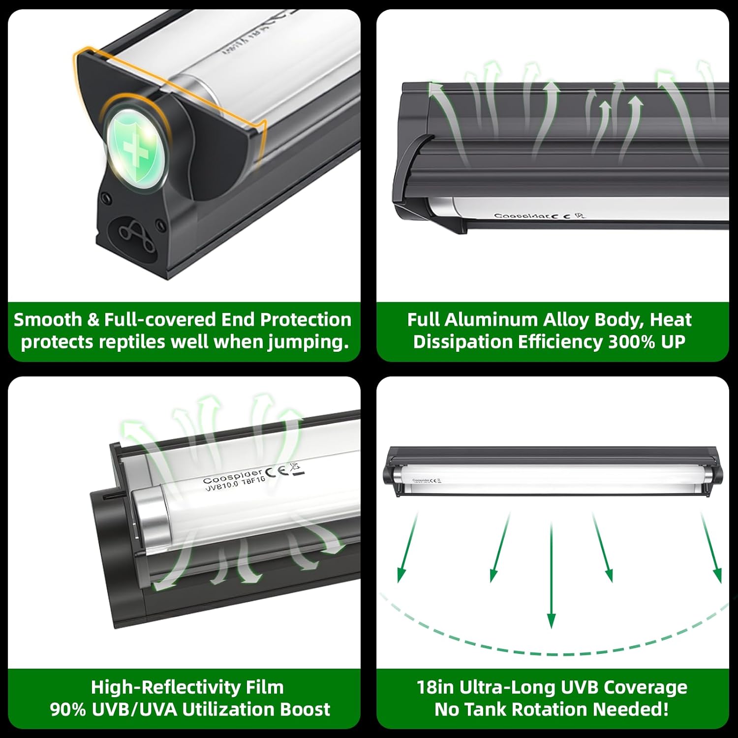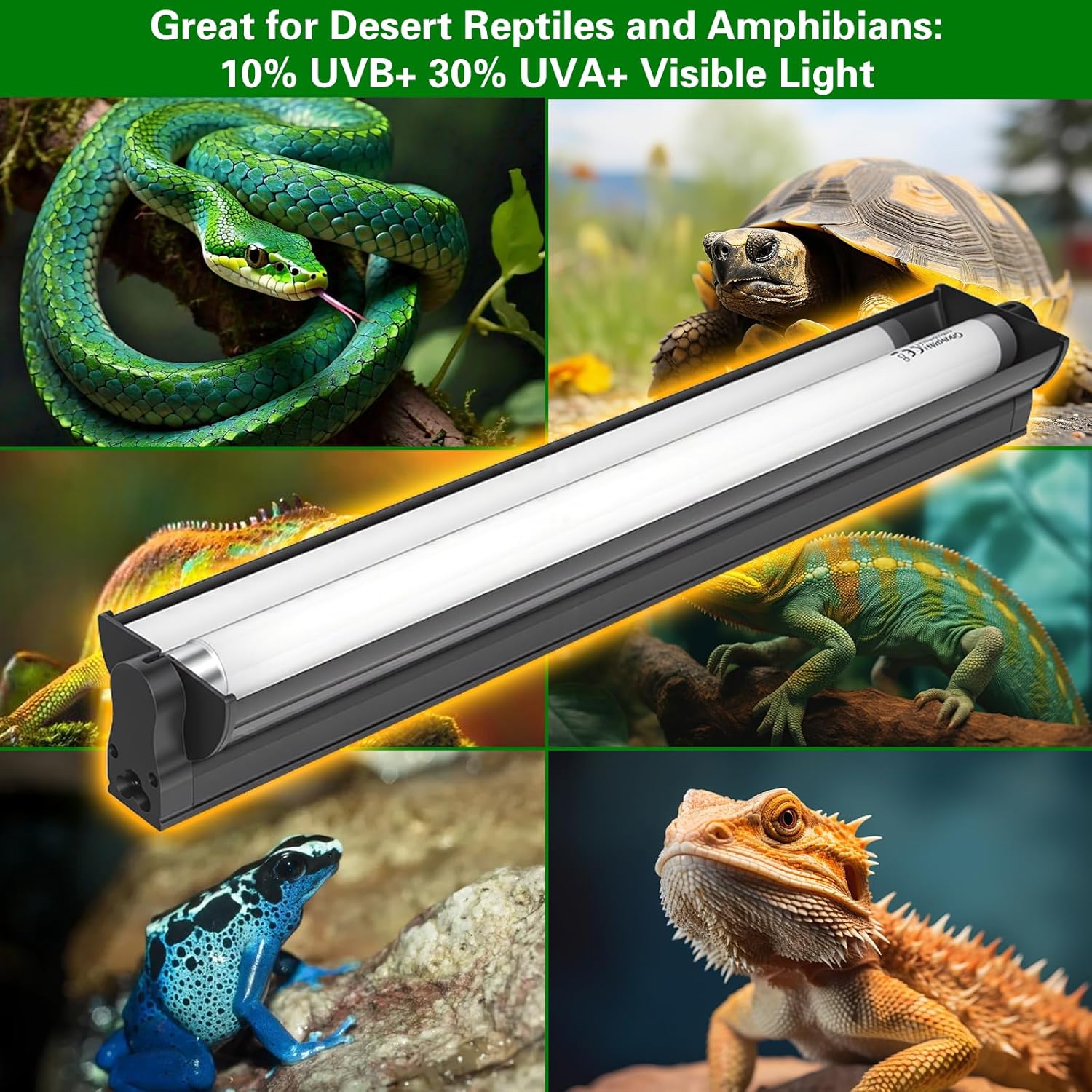 About this item 【Broader Coverage 】 With a length of 18 inches, the lamp emits a full 12 inches / 30 cm of UVB light from the surface, offering strong UVB penetration. When your pet enclosure is larger or your pet moves around, it won't affect light absorption, allowing your pet to enjoy more free time. 【Simulate Natural Sunlight】The T8 10.0 15W UVB reptile light fixture has a UVA and UVB content in the bulb that closely resembles the ratio found in natural sunlight, effectively supporting the synthesis of vitamin D3 in reptiles, helping them absorb calcium and phosphorus, and promoting healthy growth for your pet. 【High Reflectivity】This UVB reptile light fixture features a highly polished curved reflector that increases UVB/UVA utilization by over 90%. It is a high-output lamp suitable for desert animals as well as animals in tropical rainforests, such as bearded dragons, ball pythons, lizards, frogs, land turtles, and aquatic turtles. 【Full aluminum alloy body】Full aluminum alloy body provides excellent heat dissipation and a longer lifespan. The glass container cover is made of aluminum, which has heat dissipation properties to effectively reduce the operating temperature of the lamp board, slow down the light degradation rate, and extend its service life. 【Easy to Use】Our T8 reptile light is designed for simplicity and flexibility, and comes with all the necessary brackets, lamps, wires, and accessories for installation. Whether mounted externally on a wire mesh or internally on the tank lid, this linear UVB reptile light integrates seamlessly into your setup. It also features a detachable cable and an on/off switch for added convenience. The sleek and slim design ensures that it won't take up unnecessary space in your reptile's enclosure. › See more product details