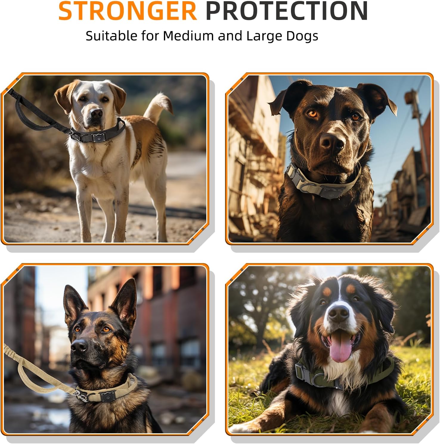 About this item 【100% Waterproof】-- This air tag dog collar holder with a fully sealed design and built-in waterproof ring. Dog can swims with it for a long time. It can keep your AirTags dry and avoid AirTag damage due to water Ingress. 【Integrated Design】-- Unlike other separated AirTag case, our Air Tag dog collar has an integrated AirTag holder, which is perfectly compatible with AirTags and effectively prevents the AirTag from falling off or or dangling. (Note: AirTag is not included.) 【Premium Material】-- Tactical airtag dog collar is made of 1000D premium quality nylon fabric and strong metal buckle, very durable and wear-resistant. Soft, breathable and comfortable padded inner won't hurt dog's fur and can protect dog's neck well. 【Double Security】-- Buckle GPS tracker dog collars is designed with Velcro and quick release metal buckle dual design. Adjustable dog collars easy to put on and take off, the metal buckle can be released quickly in case of emergency, guaranteeing safety for your dog. 【Practical Design】-- Military AirTag dog collar comes with an enlarged control handle to help you control your dog well. Available in 3 sizes, fits medium and large dogs. Please follow the size chart to measure your dog's neck carefully before you place the order to ensure the collar is fit well to your dog. › See more product details