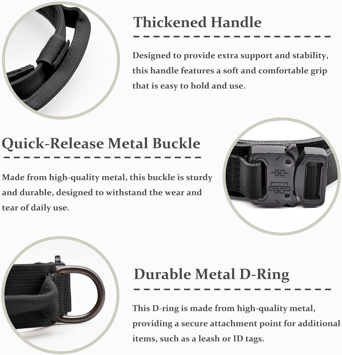 About this item 【PREMIUM MATERIAL】Tactical dog collars is made of 1000D high-quality nylon fabricnd strong metal buckle which is very durable. Soft and comfortable padded inner won’t irritation to pet skin and can protect dog’s neck well. 【DOUBLE SECURITY】Military training dog collar adopt integrated collar,magic sticker and quick release metal clasp dual design that offers double security for your dog. Metal buckle is adjustable, easy to put on and take off, you can change the length of collar based on dog’s neck size. 【CONTROL HANDLE】Adjustable Nylon Dog collar has special control handle, can efficiently control your dog when training, patrolling, walking, jogging, hunting, running, it’s perfect for medium and large dog. 【CLASSIC COLLAR】This Buckle training dog collar is a classic yet stylish collar that comes in 4 colors and 3 sizes so you can find just the right one for your dog. A separate loop on the collar makes it easy to add dog tags and leashs onto the collar. 【ADJUSTABLE LENGTH】Please take measurement of your dog's neck circumference before order placed to ensure the collar is fit well to your dog.. M - 1.5"x(13.5-16.5") ; L - 1.5"x(17-20.5"); XL - 1.5"x(20-24"). Ideal personalized dog collars for small medium large boys & girls. › See more product details