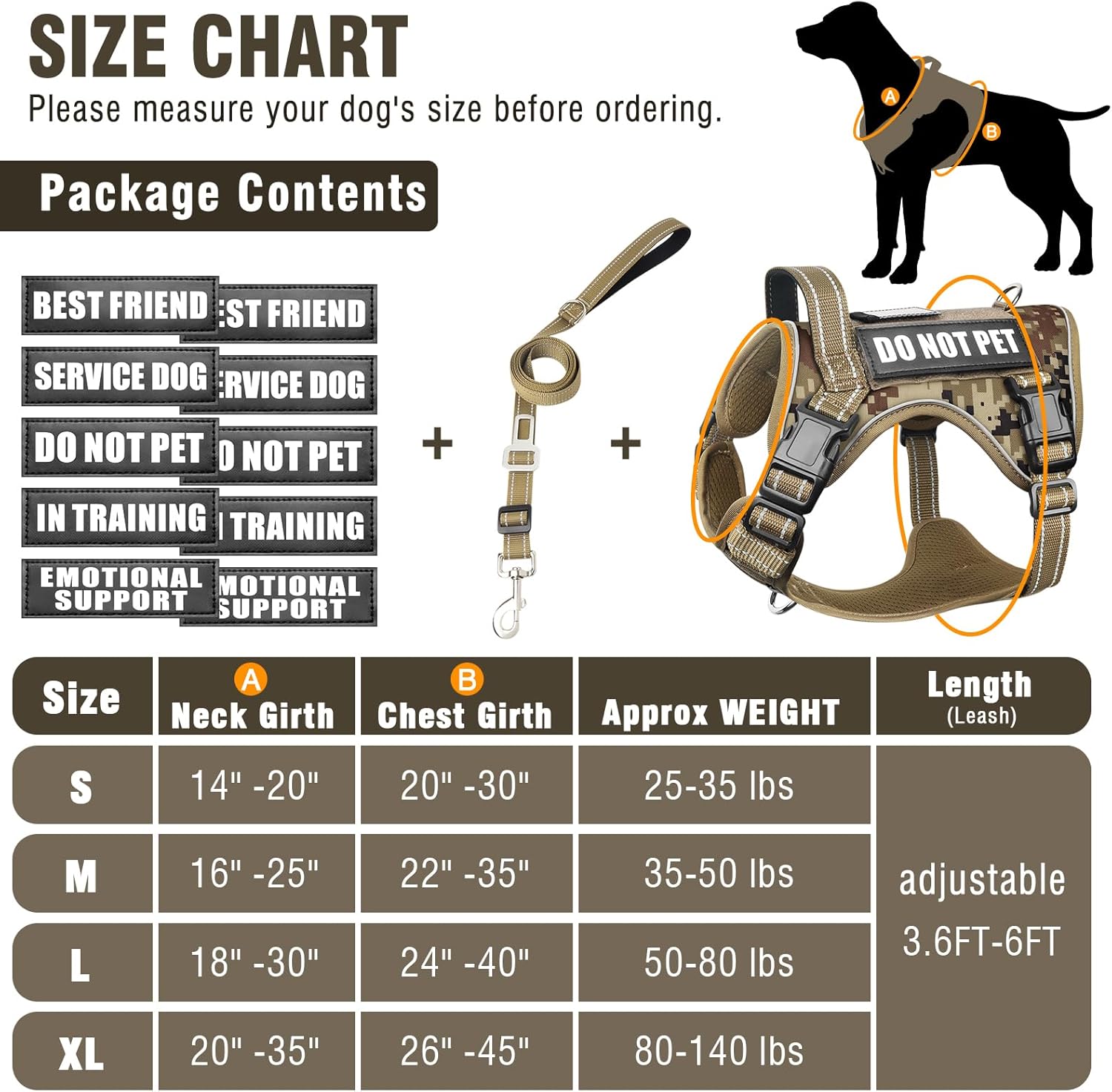 About this item 【What Will U Get?】-The easy walk dog harness set include 1 dog vest harness,1 dog leash that can be a dog car harness,1 Transparent window with anti-lost name card and 5 pairs dog patches such as"BEST FRIEND""IN TRAINING"''SERVICE DOG""DO NOT PET""EMOTIOANL SUPPORT", you can attach any informations on molle system of this dog vest to express your dog's moods and personality. 【Adjustable &Easy to Wear】-There are 4 easy size adjustors at neck and chest for easy adjusting to fit your dog perfectly and comftably,4 quick release buckles design make the service dog harness easy to put on (no need go over dog's head)and take off in 2 seconds,the heavy duty clips also can withstand great pulling force, providing security for training, hunting, walking, and any other occasions. 【Reflective Safety Design】-Reflective strips design keep fur baby a safety night walks.There is a soft padded handle on the back,it can help you easy to control your active dog,and the no pull and no chock design is no danger for dogs.There is a metal D-ring on the back and one on the chest,no matter in training or daily walking you can easily guide your puppy. 【Premium Comfy Material】-The service dog in training vest with soft breathable air mesh is gentle and skin-friendly to keep your baby cool and comfortable during outdoor activities.The bonus 2 in 1 dog leash has a metal clip that can rotate 360° and won't wrap,and it also can be a car seat belt for dogs when you go out together by car,only adjust the suitable length and insert the secure buckle then you will have a nice and safe trip. 【Size Oppiongs&Service】-There are 3 colors and 4 sizes to choose(S M L XL),Ideal for German Pointer, Husky, Golden Retriever, German Shepherd, British Bulldog, Rottie Puppy, Great Pyrenees, Dobermann, Belgian Malinois, Basset Hound, Greyhound, etc.Please choose the right size based on the size chart and measure your dog's chest and neck size before ordering.If you have any quistions about our dog harness,pleash message us anytime,we will reply and solve your issues in 24 hours. › See more product details
