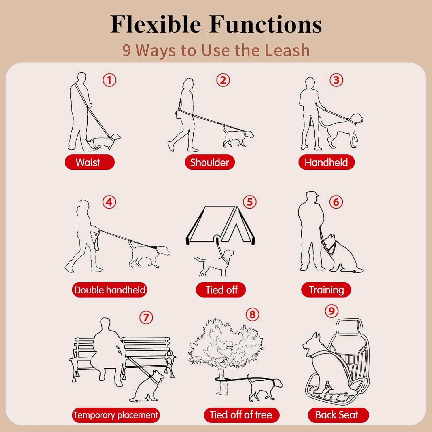 About this item 【ALL-IN-ONE CONVERTIBLE DOG LEASH – 7 FUNCTIONS IN 1】 Replace multiple leashes with a single multifunctional dog leash that easily converts into a standard walking lead, waist leash, crossbody leash, slip lead, no-pull training leash, dual-handle leash, or even a double dog leash for 2 dogs. At 9.8 ft in total length and 0.39" (10mm) thick, this leash is crafted from durable natural stretch nylon rope with rustproof silver zinc alloy hardware. Perfect for walking, running, hiking, and dog training with medium to large breeds. 【DOUBLE DOG LEASH WITH TANGLE-FREE SWIVEL】 Walk two dogs at once without the hassle. The double leash for 2 dogs function shortens to approximately 4.2 ft, giving you tighter control and better handling in busy areas. Equipped with heavy-duty 360° swivel lobster clasps, this leash prevents tangling and keeps both dogs safely by your side. A must-have dual dog leash solution for multi-pet households or professional dog walkers. 【ADJUSTABLE LENGTH FOR TRAINING & EVERYDAY WALKS】 Whether you need a short 4.5 ft leash for crowded sidewalks or a long 8 to 9 ft lead for relaxed strolls, this adjustable dog leash adapts to your needs. The strong yet flexible rope is recommended for dogs 15–125 lbs and provides the versatility needed for leash training, recall exercises, or casual walks. Specially suited for gentle pullers over 50 lbs, this leash gives you full control while keeping your dog comfortable. 【HANDS-FREE WAIST & CROSSBODY OPTIONS】 Free up your hands and move naturally with the waist dog leash or crossbody leash setup. Secure it around your waist for jogging, hiking, or running errands, or wear it over the shoulder for convenience. The adjustable design adapts to your waist size or height, making it ideal for multitasking. With your hands free, you can answer calls, carry bags, or hold a coffee — all while maintaining safe control of your dog. 【DUAL HANDLE, SLIP LEAD & NO-PULL TRAINING LEASH】 Gain extra control with the dual handle leash option, which lets you create a second handle anywhere along the rope for closer handling of strong pullers. Switch to a slip lead (approx. 4.4–5.1 ft) for quick adjustments and training corrections, or use the no-pull double clip leash by attaching to the front and back of your dog’s harness to reduce pulling. A true training leash for small, medium and large dogs, built for safety, control, and comfort on every walk. › See more product details