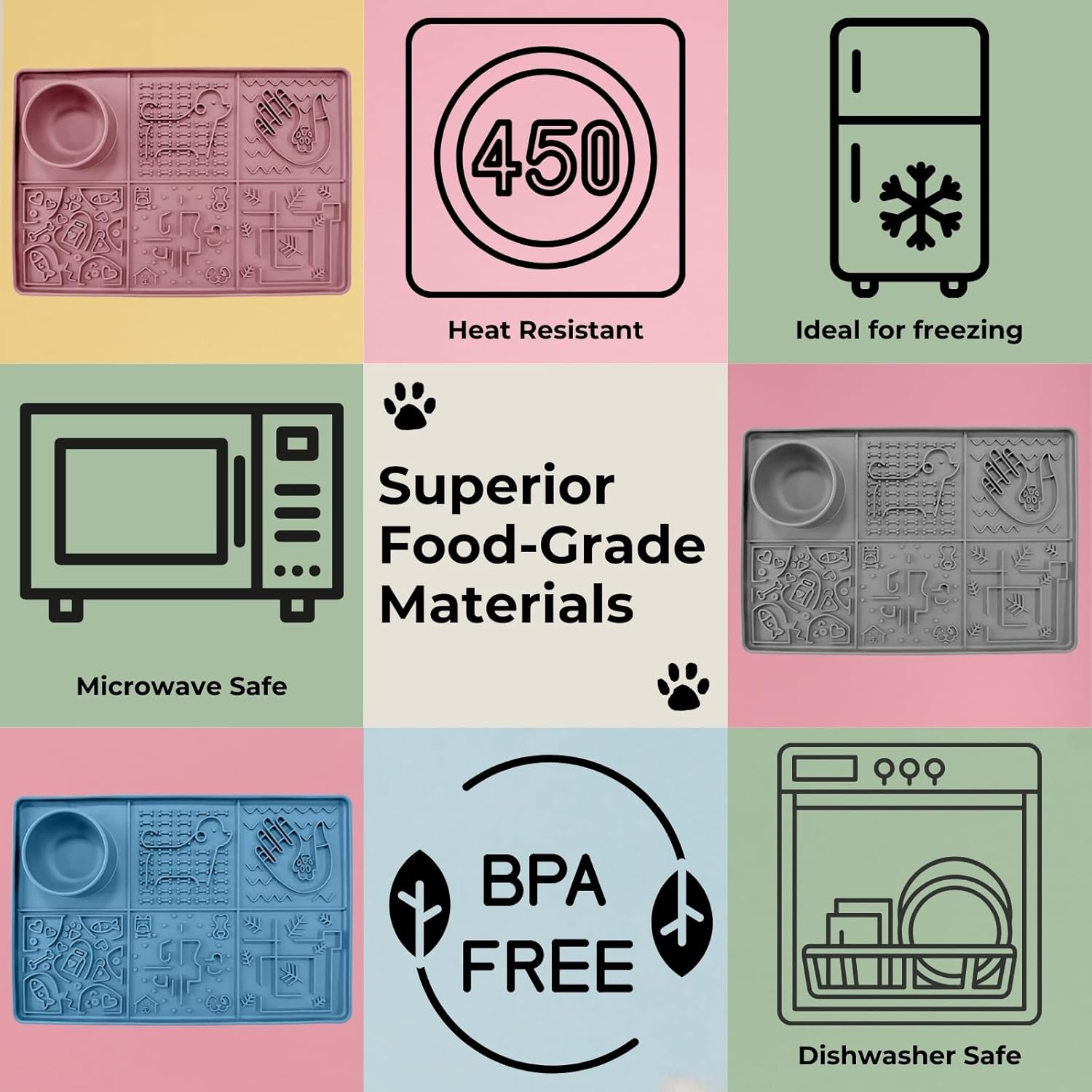 About this item 【Slow Feeder & Digestion Support (11.2×16.7 in Large Lick Mat)】 Multi-texture dog lick mat with 6 zones encourages slower licking of peanut butter, yogurt, wet food, helping curb gulping to reduce bloating/choking risk and support healthy digestion. Works as a slow feeder, enrichment toy, and cat lick mat for puppies, adult dogs, and cats. 【Reduce Anxiety, Boredom & Destructive Behaviors】 Licking helps release endorphins to calm anxious pets and keep dogs busy during grooming, bathing, nail trims, crate time, vet visits, thunderstorms, and fireworks. A proven dog enrichment toy that turns stressful moments into focused, soothing engagement. 【110 Strong Suction Cups—Stays Put on Smooth Surfaces】 Upgraded 110 high-strength suction cups lock the licking pad to tile, glass, stainless steel, bathtubs, and refrigerators for no-slip use. Tip: press from the center outward for best adhesion; spread treats in the divided sections to minimize mess and splatter. 【Premium Food-Grade Silicone—BPA-Free & Pet-Safe】 Made of durable, food-grade, BPA-free silicone that’s non-toxic, odor-resistant, and gentle on tongues and gums. Built to withstand daily use as a dog peanut butter lick pad, cat lick mat, and training aid without tearing or warping. 【Easy to Clean & Freezer-Safe】 Rinse after use or place on the top rack of the dishwasher for quick cleanup. Freezer-safe for chilled treats that extend licking time and boost enrichment—perfect for summer or high-energy pets. A practical pet feeding accessory that makes everyday care easier. › See more product details