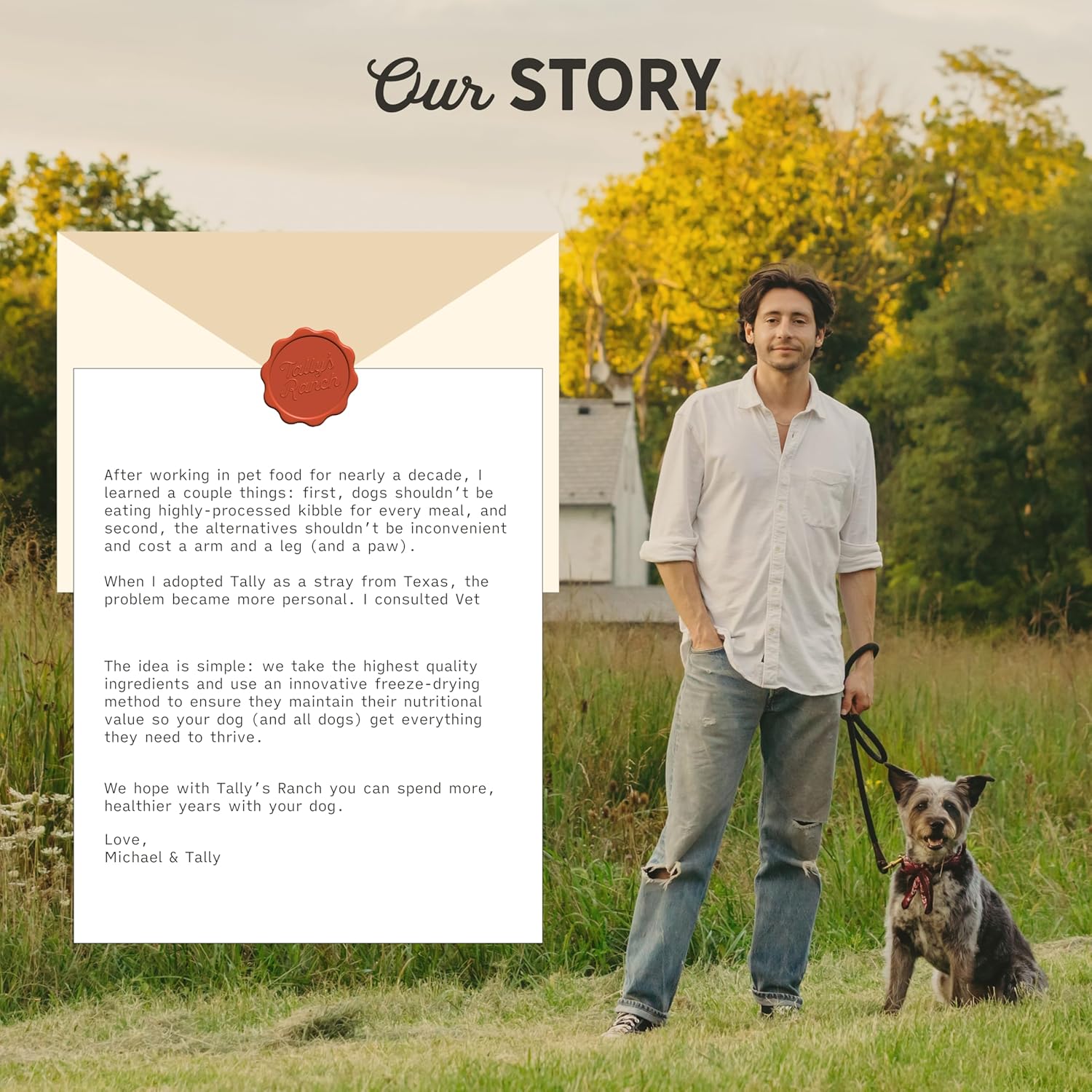 - Directions: It’s important to gradually transition your dog's diet so that their digestive system can smoothly adjust. In the beginning, start by mixing 25% of Tally’s Ranch in with 75% of your dog’s typical daily food. Gradually increase the amount over 7 to 10 days until your dog is on 100% Tally’s Ranch.