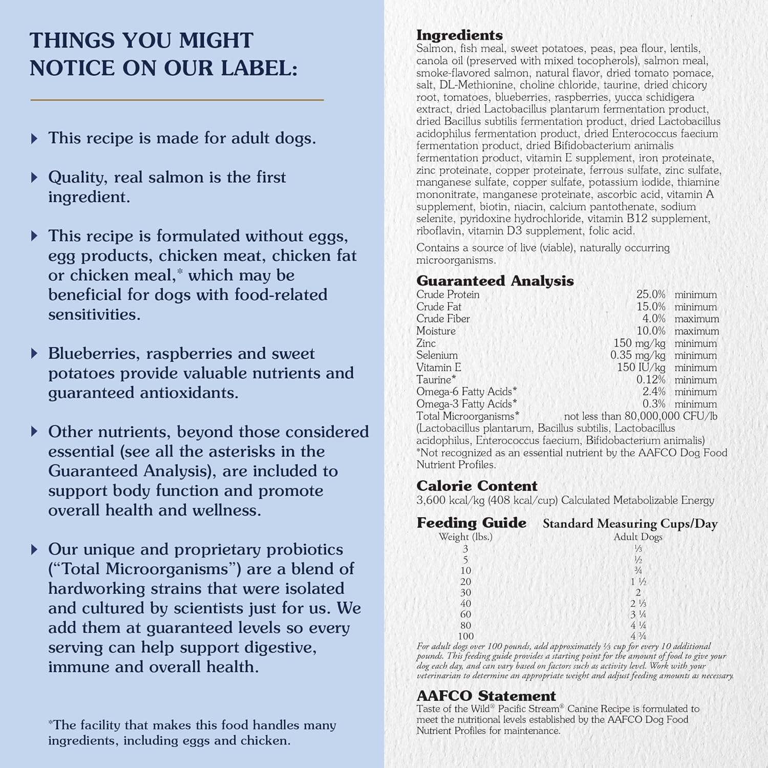 - Warranty Description: Crude Protein 25.0% minimum Crude Fat 15.0% minimum Crude Fiber 3.0% maximum Moisture 10.0% maximum Zinc 150 mg/kg minimum Selenium 0.35 mg/kg minimum Vitamin E 150 IU/kg minimum Omega-6 Fatty Acids* 2.4% minimum Omega-3 Fatty Acids* 0.3% minimum Total Microorganisms* not less than 80,000,000 CFU/lb (Lactobacillus plantarum, Bacillus subtilis, Lactobacillus acidophilus, Enterococcus faecium, Bifidobacterium animalis) *Not recognized as an essential nutrient by the AAFCO Dog Food Nutrient Profiles