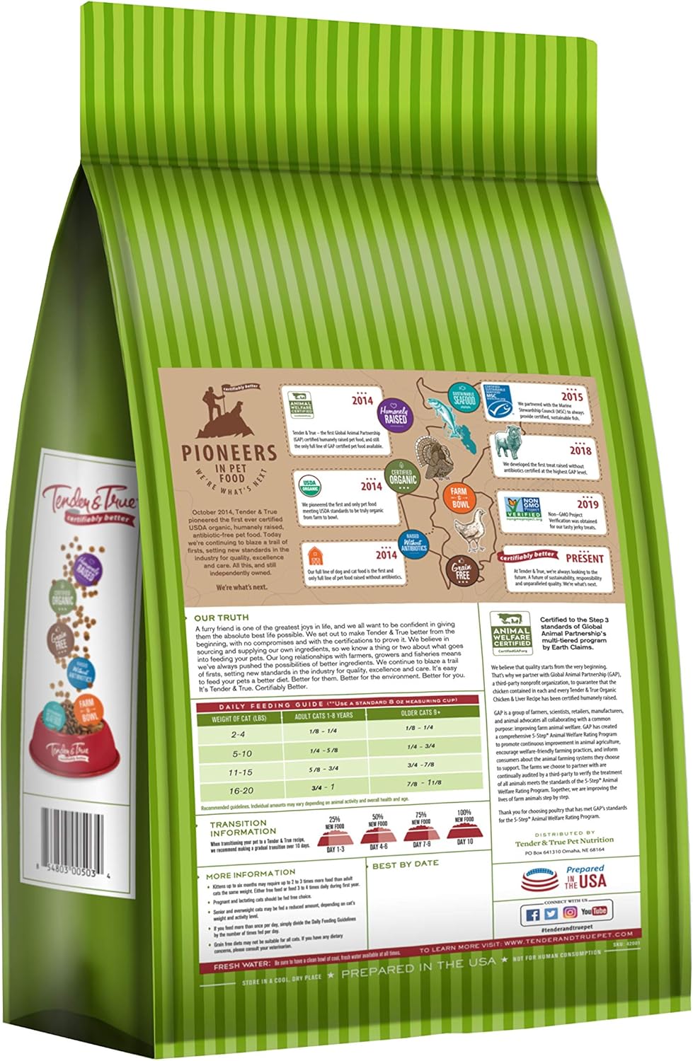 We start with organic chicken as the #1 ingredient. Our recipes are made with a precise blend of organic ingredients, antioxidants, vitamins and minerals expressly blended for optimal nutrition. No corn, wheat or soy is added to our recipes. Additionally, no artificial preservatives, colors or flavors are included in our premium pet food. Formulated by our pet food nutritionists, Tender & True Organic Premium Chicken & Liver Recipe cat food is formulated specifically for all cats throughout all life stages.Feeding InstructionsFor Adult cats feed 1 3/4 cans per day per each 7 lbs of bodyweight. For pregnant and nursing mothers and for kittens up to 1 year of age feed up to 3 times as much as for Adults or up to 5 cans per day. The amount of food your cat requires will depend on activity, age, environment and breed. Feed at room temperature and refrigerate unused portion in a non - metallic container. Remember to always keep fresh, clean drinking water available for your cat.Transition InstructionsWhen changing to Tender & Cat Food, some cats may do better by making a gradual transition over 7 days. Start with 25% of the new food mixed with 75% of the previous diet, and gradually increase the new while decreasing the previous until the transition is complete.
