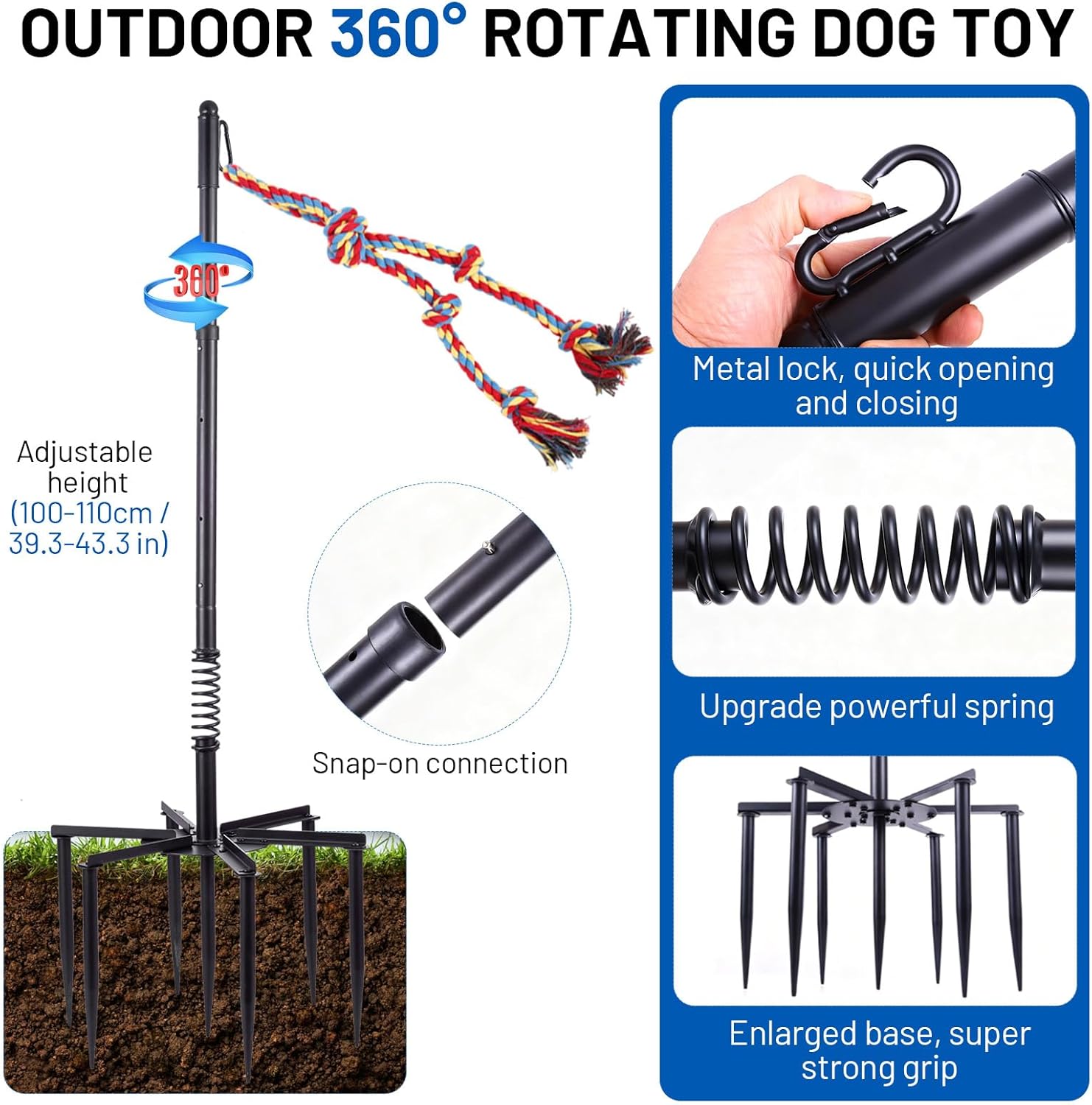 【Durable outdoor dog toys】 The tether tug for large dogs metal rod and spring design of heavy-duty tether tug outdoor dog toy can effectively prevent the metal rod from overstretching and breaking.Even if you are not by your dog's side, you can rest assured that your dog can enjoy solo exercise in the backyard and park 【Firmly fixed on the ground】 The spring pole for dogs has 6 thickened and lengthened ground nails, providing strong grip support for the spring frame, preventing the drag frame from being easily pulled out or broken, allowing the dog to fully enjoy the toy.This tether tug outdoor dog toy only takes a few minutes to install in the backyard.Even if you are too busy to keep them company, your dog can still enjoy the fun of dragging toys. 【Suitable for all dog breeds】This tether interactive dog tug toy can adjustable height - The height of the leash dog self-play stand can be adjusted between 39.3 inches and 43.3 inches.The outdoor tug of war toy is suitable for various dog breeds and body types, including Corgis, Pomeranians, Huskies, Labrador Retrievers, etc. 【Complete game set】The tethered tugboat outdoor dog toy includes 2 replaceable ropes and 1 bell, suitable for dogs to play for a long time.This tether tug dog toy independent leash pull outdoor dog toy is suitable for any park or yard lawn surface,bringing multi-functional fun.An essential interactive toy for dogs, bringing endless interaction. 【Easy installation】There are 6 poles at the bottom of the tether outdoor dog tug.After fixing the poles, insert outdoor tethered dog toy into the lawn.Do not install tether tug outdoor dog toy in a place that is too wet or too sandy, as this may cause the poles to slide out easily.Before your dog plays, please make sure the toy in the dog yard is installed firmly. › See more product details