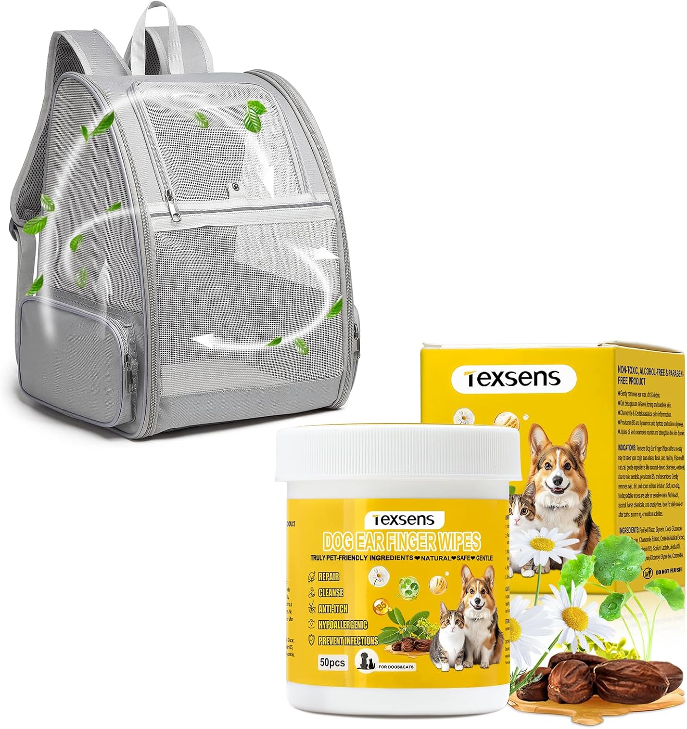 - Style: Texsens Pet Backpack(Grey) & Ear Care Wipes Combo