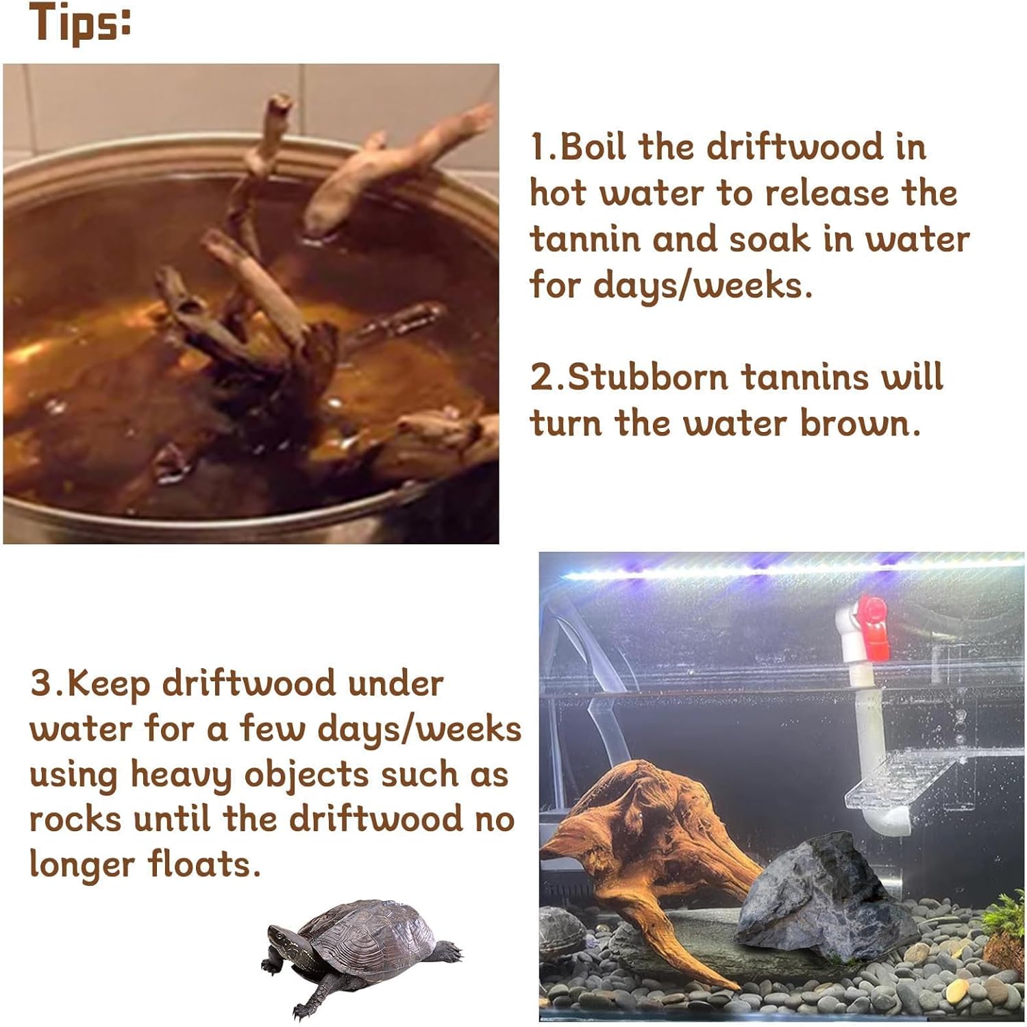 - Directions: Driftwood needs to be boiled until the tannins are completely eliminated to avoid affecting your aquarium.