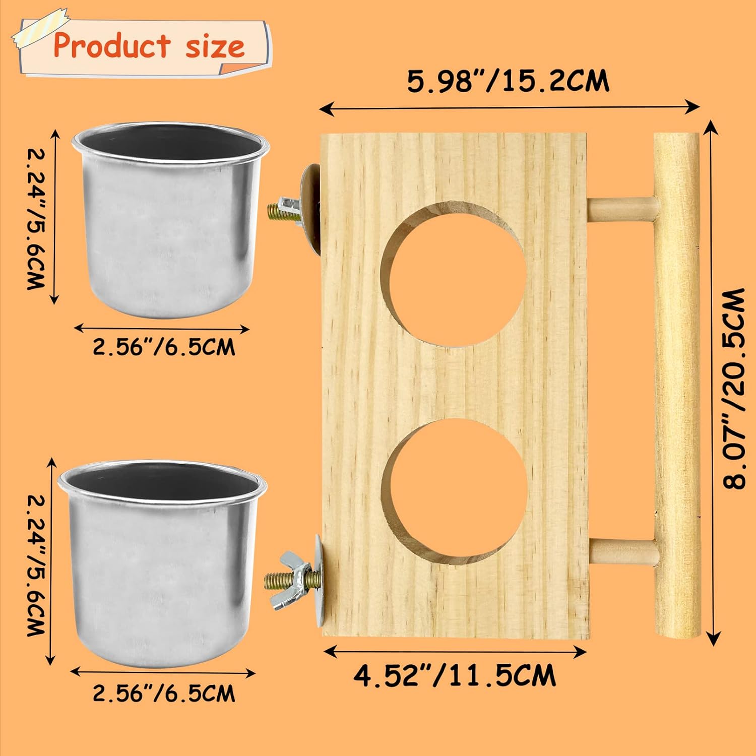 About this item High Quality Material: Tfwadmx bird food bowl set is made of natural wood & stainless steel, anti-rust and anti-corrosion, not easy to break and can be applied for a long time. This product is an excellent choice for feeding your pet birds, providing a suitable setting for them to grow Design Upgrade:Our bird feeding bowls with platform gives small pet a place to sit, play, climb or rest. Also satisfies small animals' natural instincts to be above ground level for eating and sleeping. You can wear them with chew toys to increase pet's life interest and exercise pet's chewing ability Perching & Chewing:In front of our bird food bowl is a wooden stick on which your pet can stand to eat or rest. Of course, because of our excellent selection of material, your pet can also peck at it when bored. The combination of different bird feeder can meet your birds needs Easy To Install And Clean:The parrot perch stand has screws and gaskets which can easily fix the bird platform on the cage. The two parrot feeding cups can be easily removed so it's very easy to clean. Our bird bowls are moderate in size, perfect for parrot greys budgies parakeet cockatiels conure lovebirds finch pigeon Package Includes:1 x wooden perch (4.33 x 7.87 in), 2 x stainless steel bird food bowl (2.56 x 2.36 in). Our cockatiel perch stand with cups can meet the needs of parrot habitat, bird feeding, bird rest, parrot drinking water, exercise chewing function and so on. It is a useful small animal foraging toy and treatment tool › See more product details
