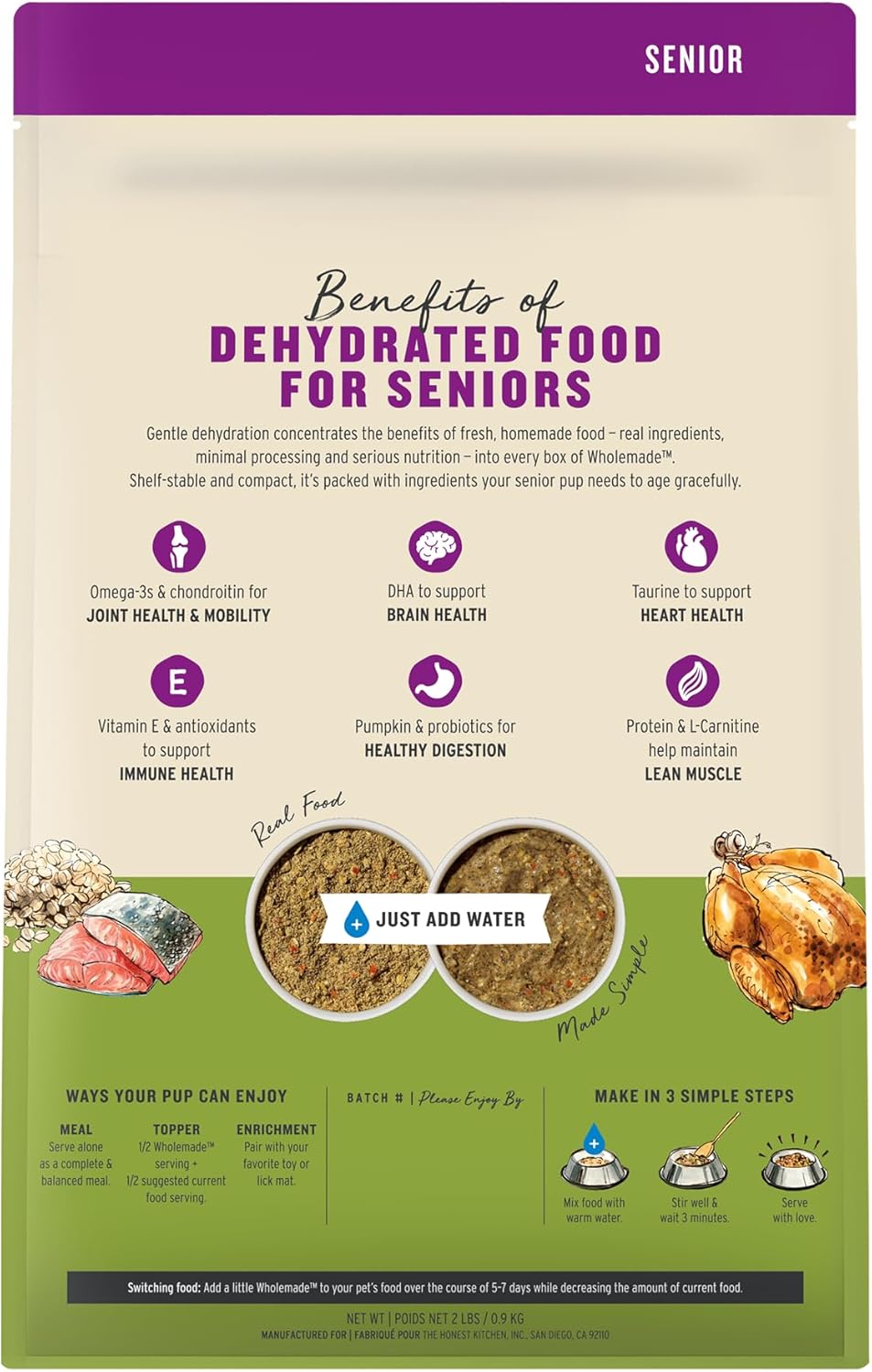 The Honest Kitchen’s Wholemade™ dehydrated senior dog food helps support joint health & mobility, brain health, heart health, immunity, digestion and lean muscle retention. Use this human grade dog food as a full meal or topper.