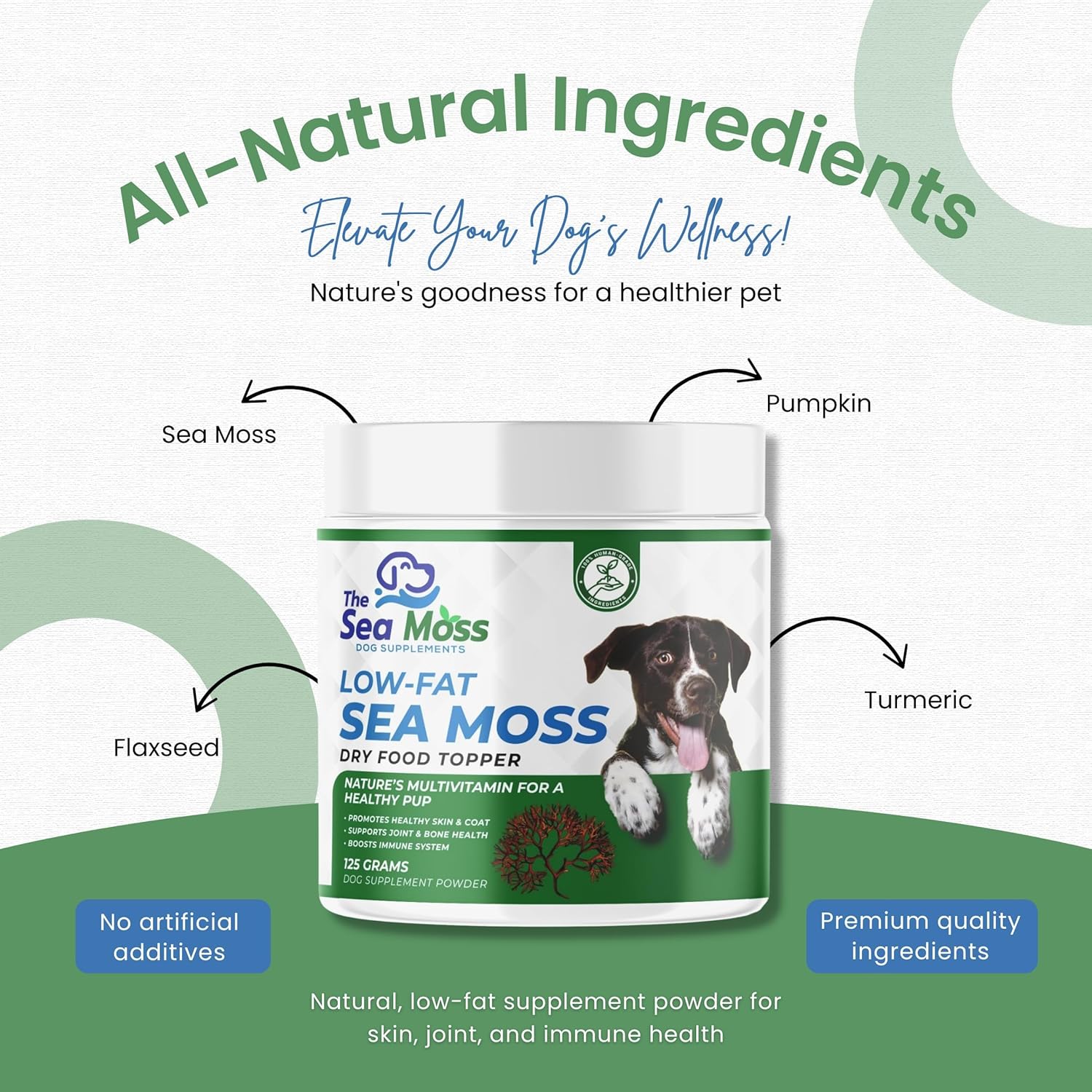 About this item Skin, Coat & Joint Care with Natural Nutrients: Provides omega fatty acids and essential vitamins that helps maintain healthy skin and promotes a shiny, soft coat. Its natural iodine content supports skin hydration and elasticity, reducing dryness and irritation in dogs of all ages and breeds. Boosts Immune System Naturally: Packed with antioxidants and vital nutrients to naturally strengthen your dog’s immune defenses. Sea moss helps strengthen natural defenses, making it a great addition to your pet’s wellness routine during seasonal changes. Low-Fat Digestive Formula: This low-fat, easy-to-digest powder is gentle on sensitive stomachs and ideal for daily use. Rich in fiber and natural probiotics to promote healthy digestion and nutrient absorption. It supports digestive regularity without added calories or synthetic fillers. A smart, nutritious addition to your pet’s dry food. Natural Health Boost Ingredients: Our probiotic powder for dogs is meticulously crafted from organic, plant-based ingredients such as pumpkin, sweet potato, flaxseed, egg white, parsley, turmeric and sea moss for complete wellness support. It's free from artificial additives, ensuring a natural and wholesome option you can trust. Easy to Use for All Breeds & Sizes: Each batch Contains 125 grams of a balanced and potent blend of dog probiotics for diarrhea. This innovative blend ensures comprehensive digestive support, promoting your furry friend's overall well-being and happiness. This sea moss powder can be easily mixed into food. › See more product details
