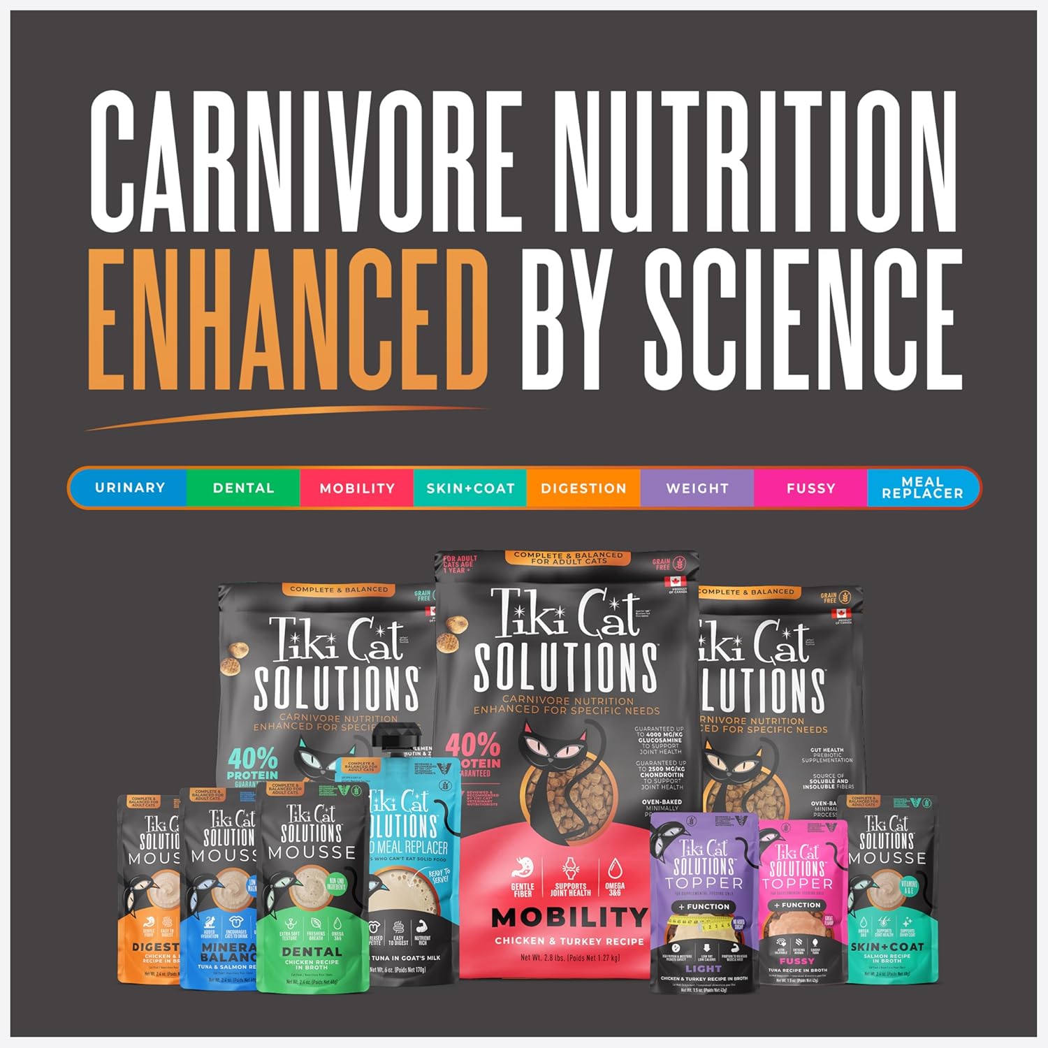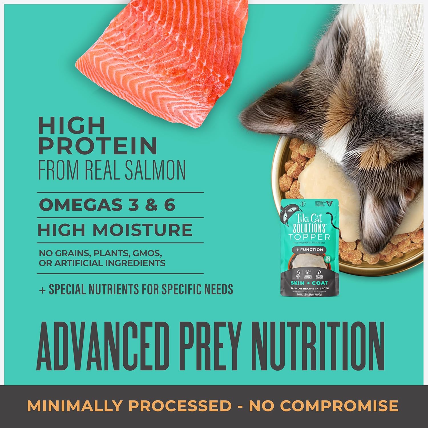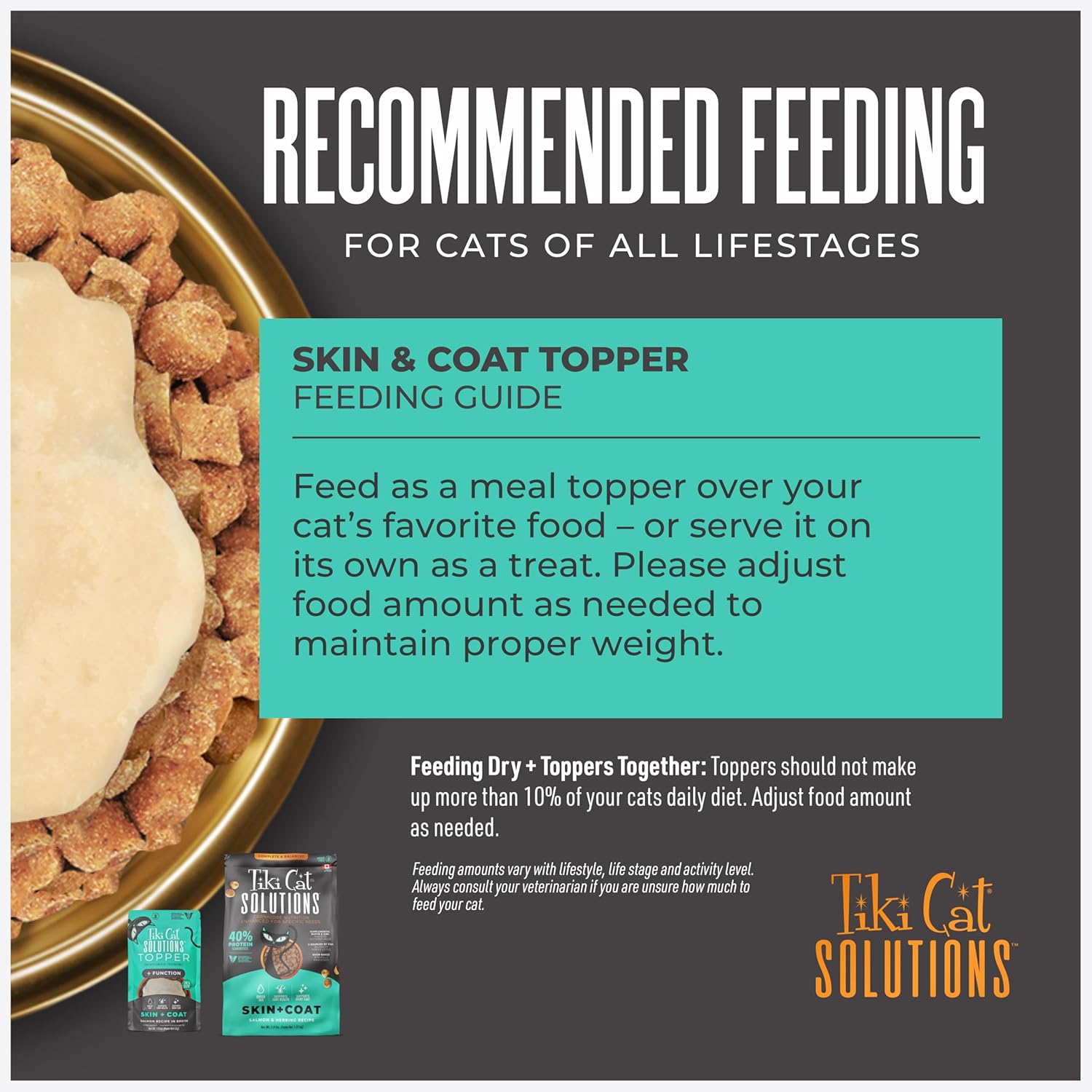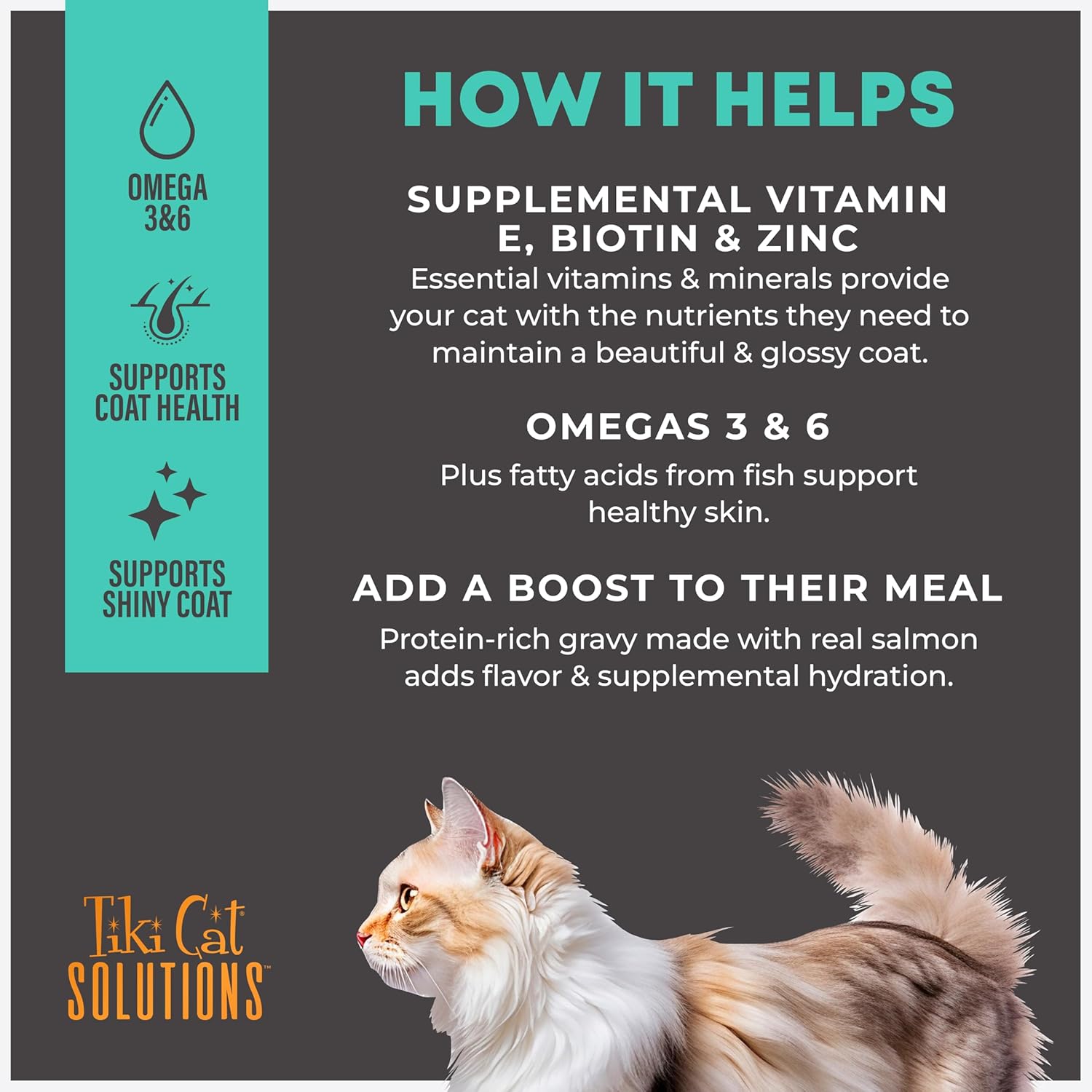 Supports Healthy Skin & Coat. All cats are born carnivores, but some have special nutritional needs. Tiki Cat® Solutions Skin + Coat Topper is a protein-rich gravy made with real salmon, omega-3 essential fatty acid sources, and vitamin E, zinc, and biotin for healthy skin & coat. Top your cat's kibble for an added boost of moisture and benefits. Reviewed and recommended by Tiki Cat(R) Veterinary Nutritionists.