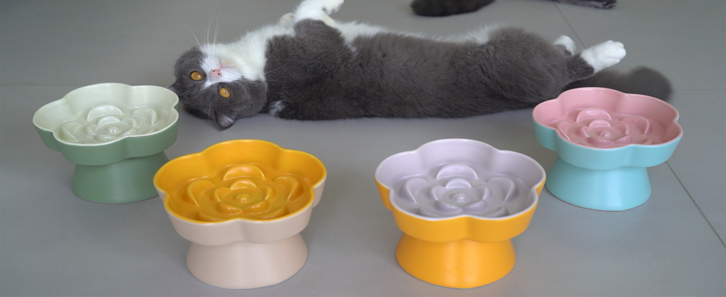 About this item Tilted & Raised for Better Digestion: This tilted cat bowl is ergonomically elevated to reduce neck strain and support joint health in cats and small dogs. The gentle tilt encourages a more natural eating posture while promoting smoother digestion. Unique Flower Design Slow Feeder: Crafted with a charming flower shape, this ceramic slow feeder cat bowl is not only adorable but also functional. The petal-inspired ridges slow down fast eaters, helping to prevent bloating, indigestion, and vomiting. Safe Ceramic & Easy to Clean: Made from high-temperature fired ceramic, our raised slow feeder cat bowl is lead-free, BPA-free, and safe for pets. The glossy finish makes it easy to clean by hand or in the dishwasher and safe for microwave use. Stable & Anti-Slip Base: Features a weighted base with anti-slip pads to prevent tipping or sliding. This heavy ceramic tilted pet bowl stays firmly in place—even with eager eaters—keeping mealtime clean and tidy. Perfect for Dry and Wet Food: Ideal for dry kibble, wet food, or fresh meals, this non-spill cat food bowl holds just the right portion size. Designed for small and medium-sized cats and puppies. Not suitable for kittens under 3 months. › See more product details