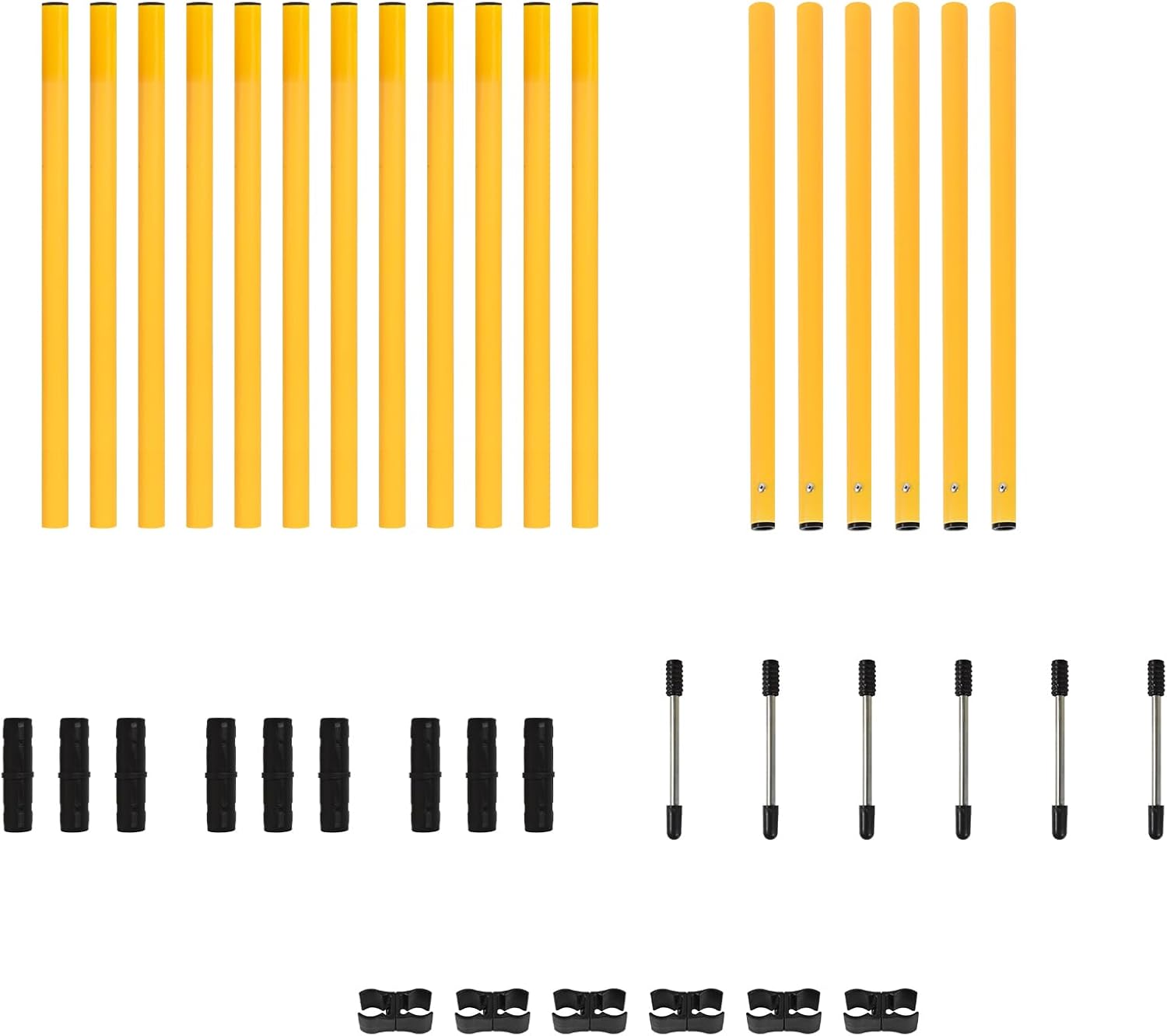 Product Description3 sets (including) : 18 poles, 9 interfaces, 6 clamps, and 6 ground nails6 sets (including) : 36 poles, 18 interfaces, 12 clamps, and 12 ground nailsColor: Yellow and blue (Due to lighting issues, the color of the received product may vary slightly.)Height: Approximately 31 inches (80cm), and the height of the hurdles can be adjusted using clipsWidth: Approximately 31 inches (80cm), and the width of the hurdles can be adjusted using clips