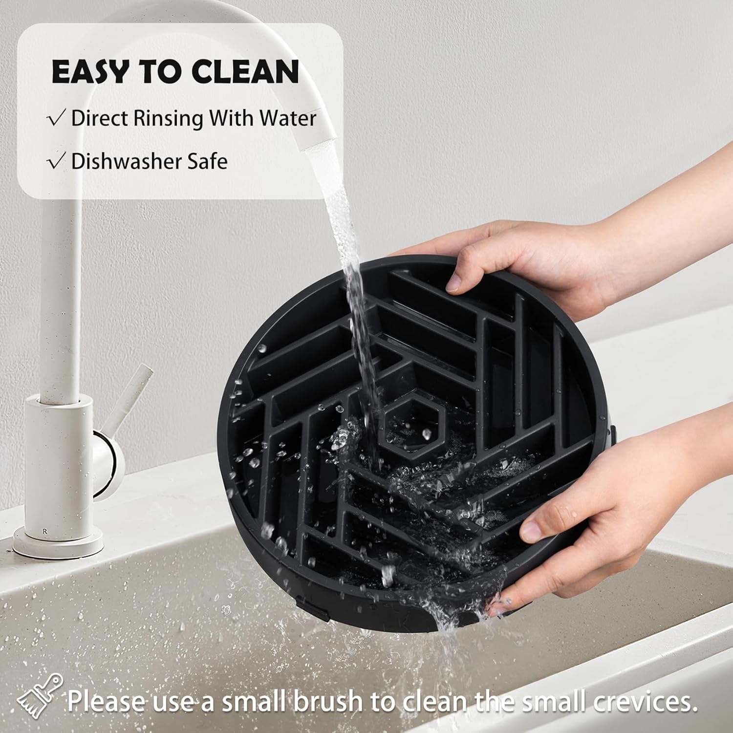 About this item 【Maze Design to Slow Down Eating】Puzzle dog bowl slow feeder designed with unique labyrinth exploration effectively works to slow down dog’s eating rate, especially for those likely to gobble up. Slow eating dog bowl helps prevent bloating, discomfort, and promotes better digestion, while also encouraging healthier eating habits and reducing overeating 【Safe Non-Toxic PP Dog Food Bowl】Made from food-grade, high-strength PP materials, the TOBYTO slow feeder dog bowls are BPA, PVC, and phthalate free., ensuring they are safe and resistant to damage. The wide gaps in the dog bowl encourage your dog to use their tongue to navigate and retrieve food, adding an element of fun and challenge to mealtime while promoting a slower, healthier eating pace 【Various Colors & Diet Diversity】Diameter: 25 CM (9.84 inches); Height: 4.4 CM(1.73 inches). Fun dog bowls are available in six colors (Black, Pink, Dark Green, Dark Blue, Light Blue, Dark Gray), and suitable for large medium breeds. These slow feeder bowl are great for dry, wet, or raw food diets, holding up to 2-4 cups of dry food, which can fit a healthy and full meal for your lovely dogs 【Easy Clean & Time-Saving】Cleaning the tobyto dog slow feeder bowl is a breeze! Whether it's dry or wet food, the dog feeder supplies is dishwasher safe or can be easily cleaned by hand with warm water and detergent quickly. It also will save more of your time on cleaning and go and spend it with your furry friends 【Non Slip Dog Dishes】No more mess on the floor! The anti-slip rubber pads keep the tobyto slow feeder dog bowls large breed stable, keeping it in place, preventing movement during mealtime and protecting your floor or carpet from damage, so that ensure a mess-free eating experience for your dog › See more product details