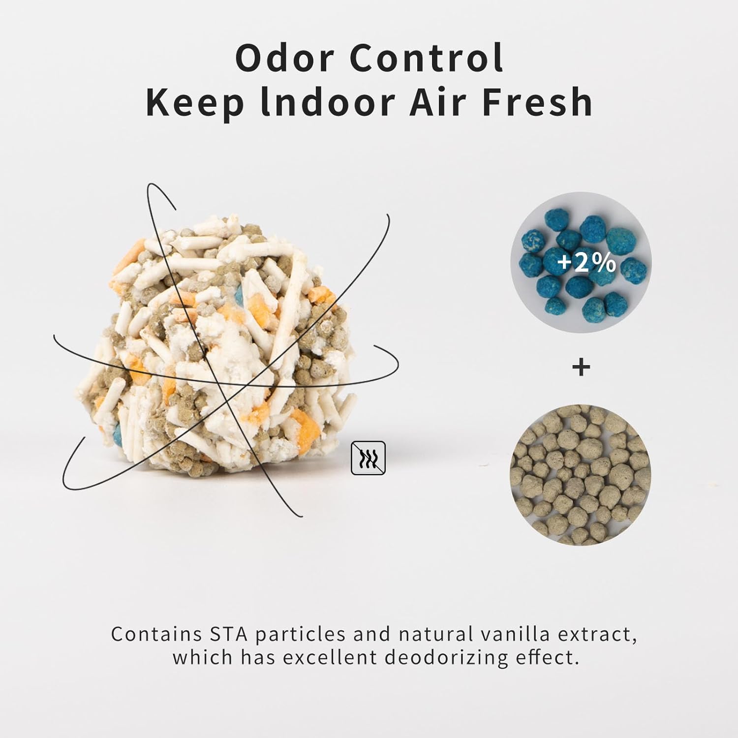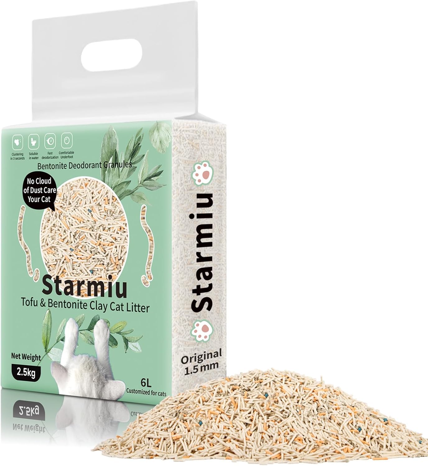 About this item 【Starmiu Mixed Cat Litter】Flushable cat litter made from pure natural ingredients, 70% tofu cat litter, 28% bentonite cat litter and 2% STA deodorizing particles, it can provide maximum absorption, deodorizing and clumping capabilities. It is ideal for making the cat litter box cleaner and fresher. 【 Natural & Dust-Free】The clumping cat litter oder control is made of pure soy, does not contain artificial flavors and chemicals, the ingredients are natural and safe, its sponge-like structure ensures excellent water absorbency, lightweight, high hardness, not easy to break, low dust, can create a cleaner environment, breathing friendly. 【Quick Clumping & Save Usage】The low tracking cat litter is made of high-quality mineral bentonite from Europe. The tiny particles can fill the gaps in the tofu cat litter, increase the contact surface, and help it clump faster and more tightly, making it more economical to use and more durable. 【Low Tracking & Odor Control】The 2mm cat litter pellets are not easy for cats' claws to stick to, reducing the amount of cat litter being carried out and keeping the floor clean. The addition of STA functional particles effectively neutralizes odors, tofu litter with added vanilla scent, minimizing any unpleasant smells from spreading. 【Strong Water Absorption & Flushable】This advanced formula absorbs up to five times its weight in water, 3 seconds for fast absorption, offering incredible value. Soluble in water, can be flushed into toilet (Please don't pour too much at once). Starmiu’s vacuum-packed, compact packaging makes it easy to store and stockpile, while also being an economical choice for long-term use. › See more product details