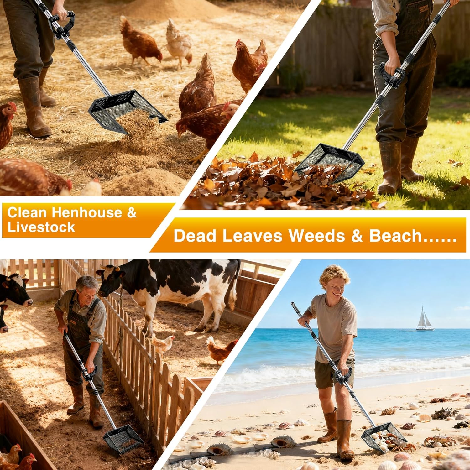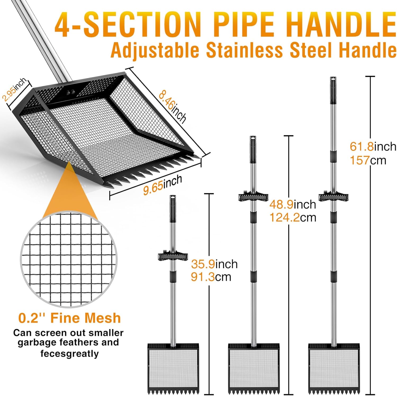【4-Section Adjustable Long Handle】Detachable handle extends to (23"/36"/49"/ 62") - adjusted the length use as cat litter scooper, beach search sand scoop or cow pens shovel. The ergonomic auxiliary handle is comfortable to grip and can increase the force point and reduce wrist fatigue, no bending, knee and back saver 【Industrial-Grade Materials 】Chicken scooper for poop built with full rust resistant thicken stainless steel, this poop scoop withstands heavy-duty use and harsh conditions without corrosion and not easy to break and bend. A smooth, non-stick surface that rinses clean in seconds and odor-free, easy assembly and store 【Large Capacity Scoop】The chicken metal litter scoop rake is 9.6" wide can handles up to 22 lbs of waste per load, the deep depression greatly increases the capacity of the chicken coop sifting shovel, which can clean a large area at a time, saving time and increasing efficiency 【Sturdy Rake & Precisely Sifting Holes】Sturdy rake teeth quickly grab waste,and can scrape off sticky impurities, while the 0.2-inch sifting holes remove 2X more debris, separates droppings from sand and dirt with eases — no need for multiple tools and saves bedding 【2-in-1 Versatile Manure Scoop】Portable pooper scooper is ideal for Backyard Chicken Keeper, Urban Chicken Owner, Small Scale Homesteader, and every Poultry Enthusiast. As an efficient Coop Cleaner for horse stalls, ducks chicken runs, cow sheds, rabbit pens, goats pens, livestock home, farm, backyard, garden, beach, It handles leaves, pine cones, rocks, sandbox, wood chips, straw, moss, cat litter, Pet Waste, and bird droppings. Best gifts for the elderly, seniors, tall individuals, etc. › See more product details