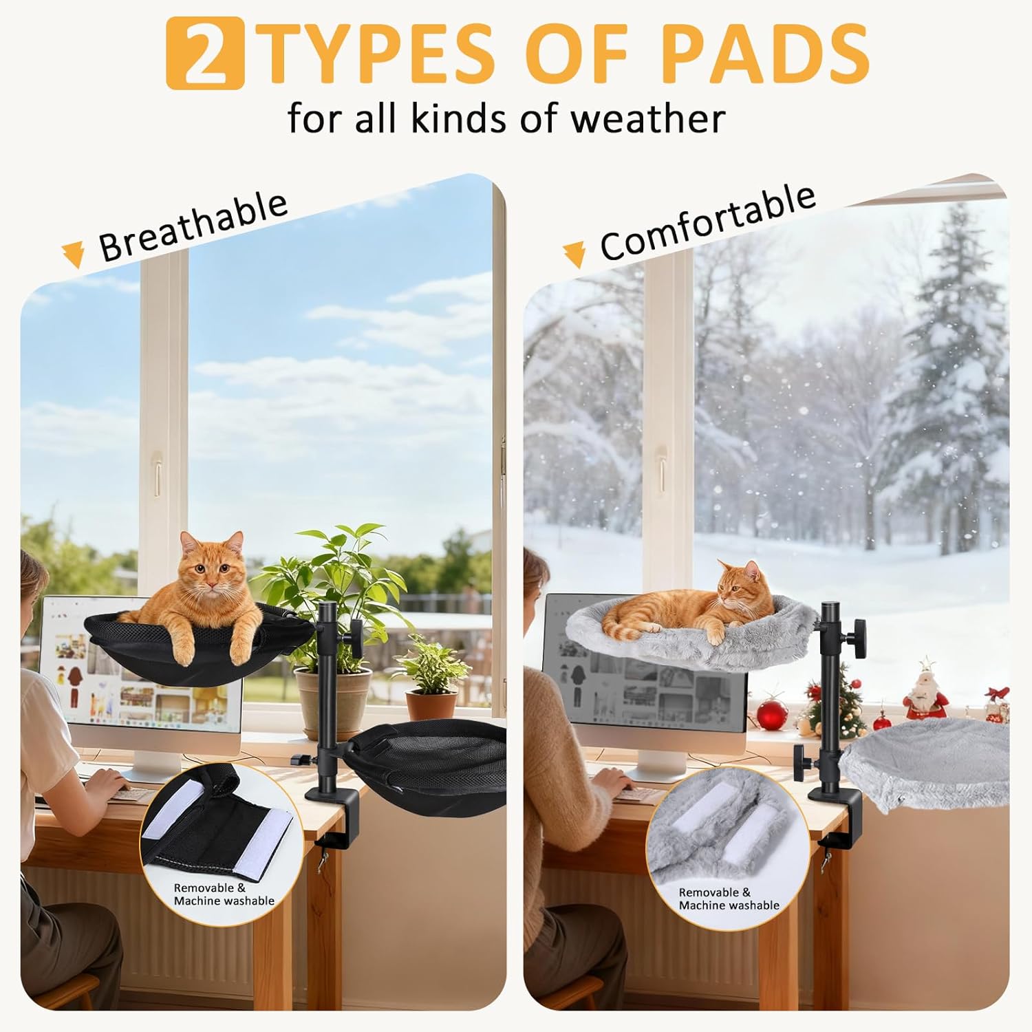 About this item 360° Rotation & Adjustable Height: The Double-Deck Cat Desk Bed features a 360° rotating arm and height adjustment (up to 11.6 inches), allowing your cat to comfortably observe your workspace from any angle. Designed for solid wood desks up to 2.5" thick, it ensures stability without damaging surfaces Dual-Season Comfort with 4 Removable Pads: Includes 4 interchangeable pads: 2 breathable mesh pads for summer and 2 plush faux rabbit fur pads for winter. All pads are machine-washable, providing year-round comfort and easy cleaning for your cat’s cozy dual-level retreat Effortless Installation & Versatile Placement: No tools required—simply secure the bed to your desk in minutes using the clamp system. Compatible with desks, under-desk areas, and wide windowsills (up to 2.5" thick), adapting flexibly to your home office or study layout Heavy-Duty Safety & Enhanced Stability: Constructed with high-strength carbon steel brackets, this double-deck cat bed offers exceptional durability and safety, supporting up to 45 lbs with ease. Its ultra-stable design prevents wobbling, even during active play, ensuring security on both levels Space-Saving Vertical Bonding Solution: Maximize your workspace while keeping your cat close. With a compact 15.7-inch diameter per tier, the vertical design saves desk space and lets your feline companion relax nearby—fostering companionship without sacrificing your productivity › See more product details