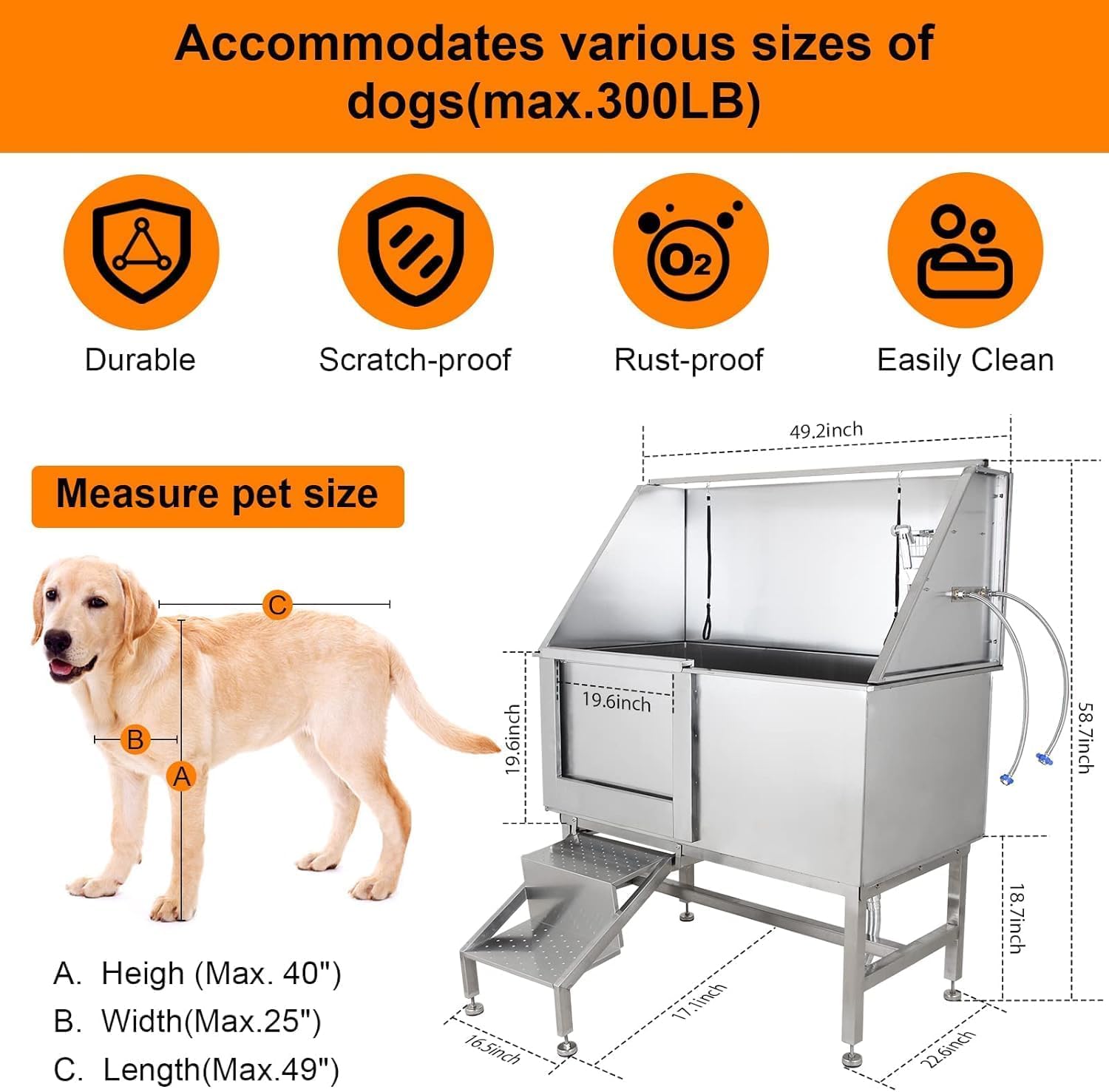High-Quality Bathtub: This pet bathtub is made of high-quality 201 stainless steel material, seamless design, excellent sealing performance, anti-corrosion and durability, ensuring that the bathtub can be used for a long time without being easily damaged. Convenient Dog Washing Station: This dog washing station features a sliding door and a detachable staircase for added convenience. The staircase allows pets to enter the bathtub effortlessly, ensuring a smooth and stress-free experience. Meanwhile, the sliding door opens easily and can be securely locked to prevent any water overflow, promoting a clean and controlled bathing environment. Versatile Dog Grooming Tub: This dog grooming tub is equipped with a multifunctional high-pressure faucet, providing efficient showering and cleaning for your pets. Additionally, it includes a stainless steel shampoo rack, allowing you to conveniently store bathing products and other essential items needed for the grooming process. Safe and Efficient Drainage Design: The floor grille of our pet bathing tub is designed with smaller holes to prevent pets from getting their nails stuck while ensuring efficient drainage. The tub is equipped with an efficient drainage system and anti-backflow pipes to minimize unpleasant odors and maintain a fresh environment during and after bath time. Spacious and Durable:The robust pet grooming tub measures 49.2 inches in length, 22.6 inches in width, and 59.2 inches in height, providing ample space to accommodate dogs of various sizes, with a maximum weight capacity of 220 pounds. › See more product details