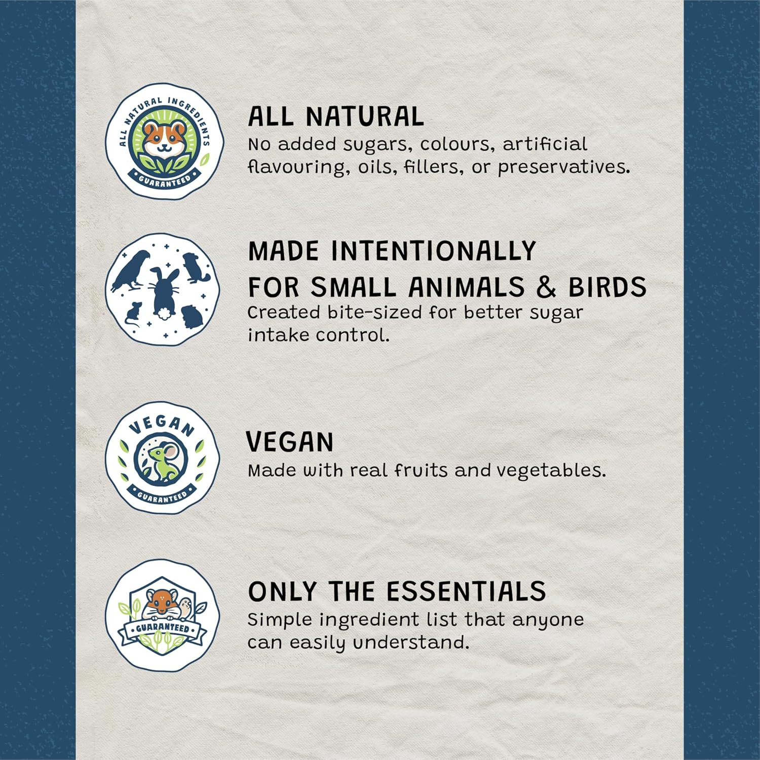 About this item - Each package contains 7 delicious flavors: Pumpkin Cilantro, Strawberry, Mixed Berry, Mixed Greens, Papaya, Banana Apple, Raspberry. Each flavor is intentionally chosen for rabbits, hamsters, guinea pigs, chinchillas, rats, mice, gerbils, and other small animals. This is a perfect choice for rodents who are picky eaters or if you are unsure which flavor your pet will enjoy the most. A 50g package contains approximately 50-55 bite-sized pieces - No Furries Delights is a Canadian-based small business that specializes in creating wholesome and intentional small animal treats and chew toys. Our treats are made crunchy and bite-sized to satisfy your pet’s instinct to chew while providing better control over their sugar intake. Crafted in small batches, our treats are packaged in a resealable bag to ensure maximum freshness - All of our treats are made with 100% all-natural ingredients, locally sourced to ensure the best quality. They are made without added sugars, coloring, flavoring, preservatives, or filler materials. Each treat is handcrafted as simply as possible with minimal ingredients - Our treats offer a range of benefits for your pets. It is both delicious and supports overall wellness. - The perfect gift for small animal lovers who want to nurture a stronger bond with their pets. These handmade treats are also the perfect size for training, bonding, rewarding, and adding to enrichment toys. They are also great as a healthy hay topper, to sprinkle over their daily greens, and encouraging foraging around their enclosure or habitat. › See more product details