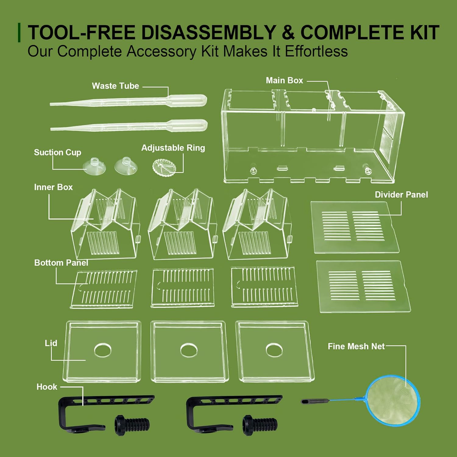 - Included Components: Fine Mesh Net*1, Triple-Chamber Box*1, Waste Tube*2