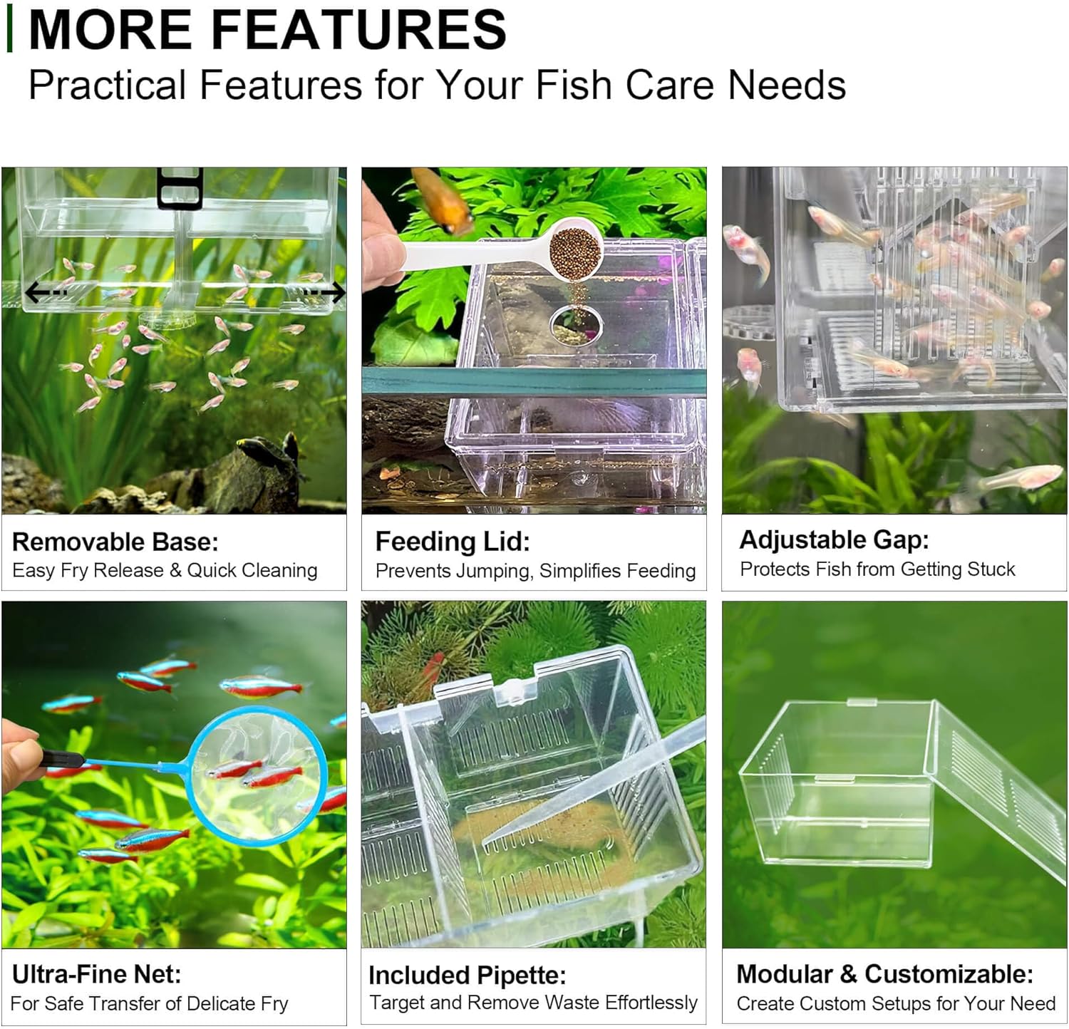 About this item Breed, Isolate, Raise - All-in-1 Box: Serves as a hatchery for livebearers like guppies and mollies, an isolation/quarantine cage for sick or aggressive fish (e.g., bettas), a dedicated acclimation space for introducing new fish, and a protected zone where shrimp can molt or feed with confidence. Triple-Chamber & Dual-Layer Design: Triple chambers (with dual removable divider panel) let you keep fish or fry apart as needed. The upper compartment lets a pregnant fish give birth, and newborn fry drop into the lower nursery section—shielding them from adult fish and improving survival outcomes. Dual Mounting Methods: The breeder box easily attaches with the included hanging hook or suction cups for flexible placement inside the tank. The adjustable spacer ring sets the box at the right distance from the tank wall so fish won’t get trapped. (For stability, keep the breeder box fully submerged during use.) Gentle on Delicate Fry: A secure lid with a feeding opening helps keep fish from jumping out. Fine 0.04" slit vents deliver ample water flow through the breeder while keeping even the tiniest fry contained. Crystal-clear walls turn the unit into a fish tank viewing box for observing behavior and health at a glance without disturbance. Easy Assembly & Complete Kit: Assembles in minutes with no tools required, and the removable bottom tray makes it simple to clean or release fish. Includes a fine-mesh net for safely catching or transferring fry, and cleaning pipettes for feeding babies or removing waste. Comes with all the accessories you need for convenient fish breeding and isolation. › See more product details