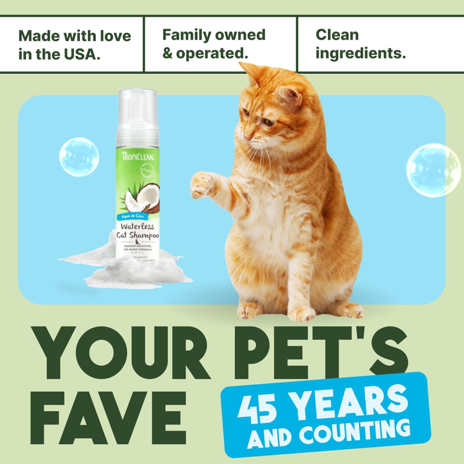 About this item NO-RINSE FORMULA – A coconut dry shampoo for cats is a no-rinse cat shampoo that provides a deep clean while reducing cat dander and allergens. FRESH & CLEAN – A cat dry shampoo that nourishes dry skin and reduces odor with a tropical coconut & cucumber scent. FEEL-GOOD INGREDIENTS – Our waterless cat dandruff shampoo is derived from natural ingredients such as aloe & coconut for a silky soft coat. PET PARENT APPROVED – The no-rinse formula is paraben, dye, soap and cruelty free and suitable for use on cats 12 weeks or older. TROPICLEAN – For a tropical experience, pair this with our deodorizing spray and hypoallergenic wipes. › See more product details