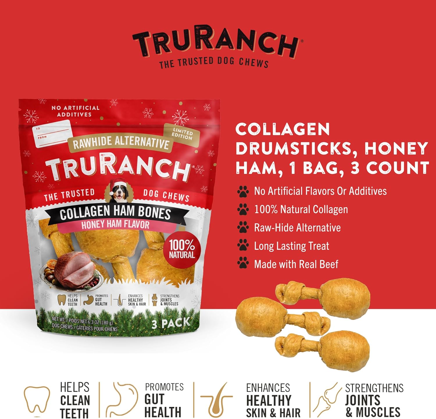 About this item Limited Edition, Rawhide Alternative, Honey Ham Collagen Rolls Superior Quality Ingredients: Made with real beef as the primary ingredient. These treats are completely free from dairy, soy, and corn, making them ideal for dogs with dietary restrictions. Allergy-Friendly Treat: Our TruRanch 6″ Collagen Rolls cater to dogs with allergies or sensitivities. The formula is free from common allergens like dairy, soy, and corn, ensuring a safe and enjoyable treat for all dogs. Promotes Overall Health: Infused with beef gelatin, a natural source of collagen, these rolls support strong joints, muscles, & a healthy gut. Regular chewing can also strengthen your dog’s dental health by cleaning teeth and reducing tartar buildup. 100 % Natural – Rawhide Alternative – Made with Hydrolyzed Collagen Peptides › See more product details