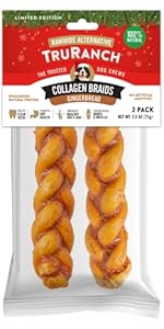 About this item Limited Edition Rawhide Alternative Gingerbread Braids Superior Quality Ingredients: Made with real beef as the primary ingredient. These treats are completely free from dairy, soy, and corn, making them ideal for dogs with dietary restrictions. Allergy-Friendly Treat: Our TruRanch 6″ Collagen Rolls cater to dogs with allergies or sensitivities. The formula is free from common allergens like dairy, soy, and corn, ensuring a safe and enjoyable treat for all dogs. Promotes Overall Health: Infused with beef gelatin, a natural source of collagen, these rolls support strong joints, muscles, & a healthy gut. Regular chewing can also strengthen your dog’s dental health by cleaning teeth and reducing tartar buildup. 100 % Natural – Rawhide Alternative – Made with Hydrolyzed Collagen Peptides › See more product details