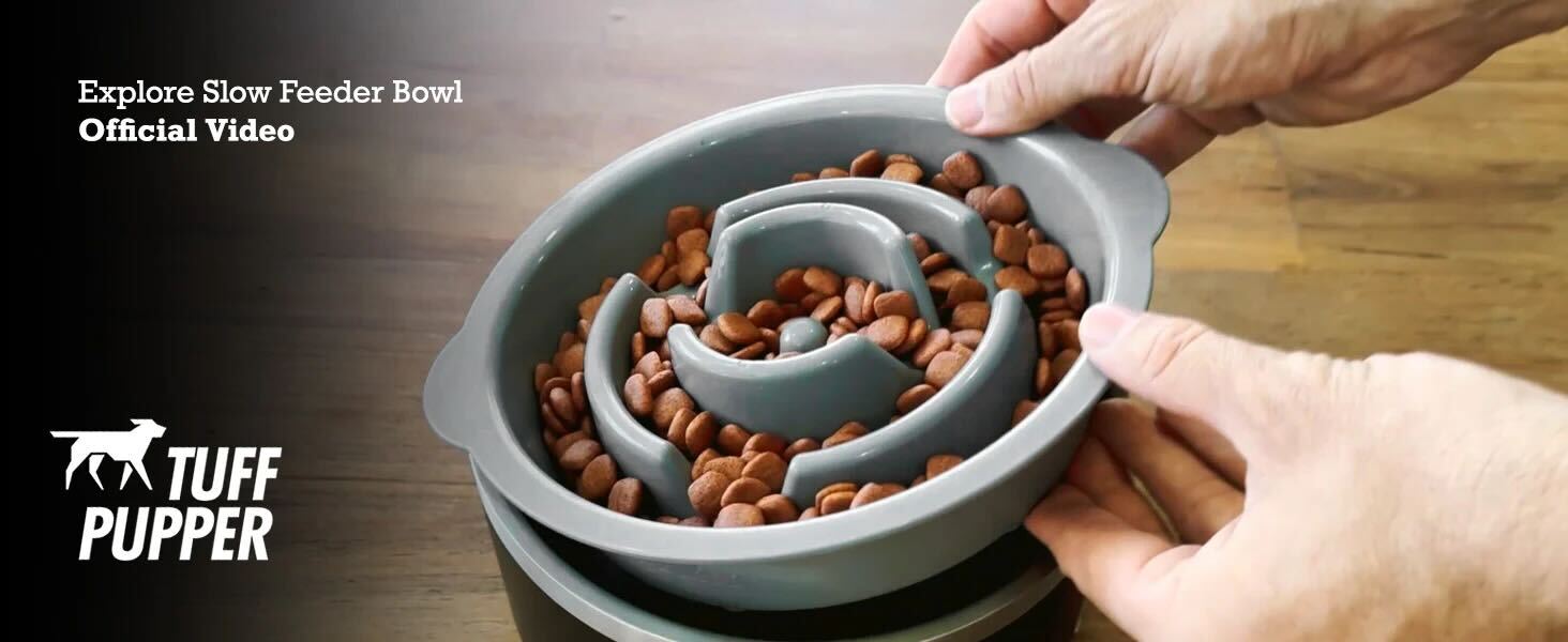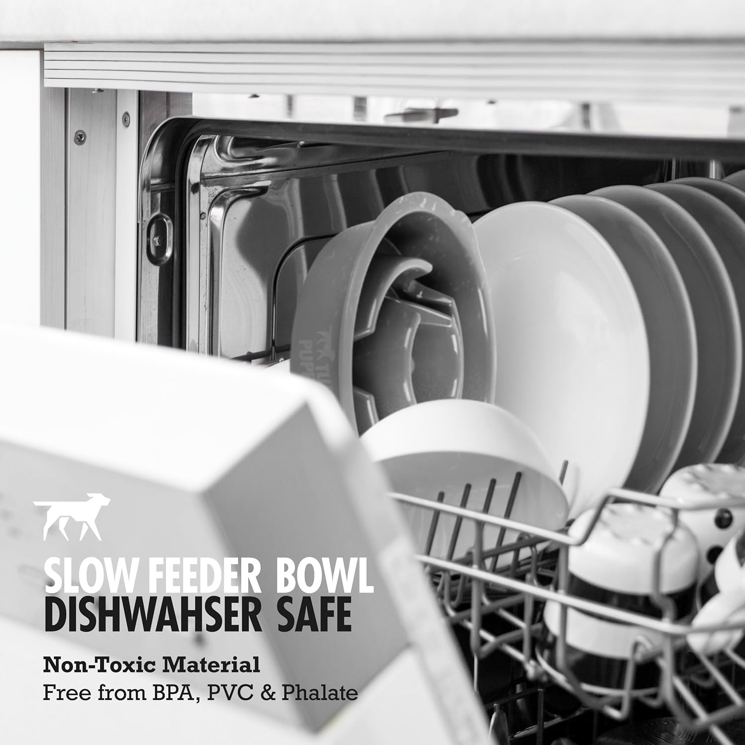 About this item SLOWS DOWN EATING UP TO 10X: (2 Cup Bowl) Our fun and interactive Slow Feeder Bowl is built with uniquely designed wave patterns that separate a full bowl of food into smaller sections that challenge your dog and require more effort to access and eat. AIDS IN PROPER DIGESTION: Fast-eating dogs often suffer from bloating, vomiting, choking and indigestion. Our Slow Feeder Insert Bowl mentally stimulates your dog during mealtime while helping reduce overeating behavior. DOGS LOVE OUR INTERACTIVE DESIGN: Our puzzle dog food bowls are guaranteed to slow down fast eating pets of all breeds and sizes. Watch as the groove patterns challenge dogs to eat slower as they work to find food in all the "nooks and crannies". WORKS AS A STAND ALONE BOWL: With many non-skid rubber pads attached to the bottom, our slow feeding bowl remains securely in place while your dog eats so you can fully replace your existing mealtime dog bowl with your new slow feeder bowl. INSERT INTO ELEVATED FEEDING TRAYS: You can replace one of the standard bowls in your dog's feeding tray with our Slow Feeder Insert Bowl. Our bowls are designed to fit into most standard size elevated feeding trays. Check your tray hole diameter before you purchase. ADD TO EXISTING METAL DOG BOWLS: By combining our Slow Feeder Insert Bowl with a standard dog bowl you get the best of both worlds - a heavier bowl that won't flip or slip (not included) plus our slow feeding puzzle bowl to slow down your fast eating puppy. FITS PERFECTLY IN TUFF PUPPER BOWLS: This 2 cup Slow Feeder Bowl was designed to fit perfectly into our 66oz SuperBigSlurp insulated metal dog bowl (sold separately). Combine them both for the perfect non-slip, non-flip weighted slow feeder bowl for the messiest, aggressively eating dogs. SAFE FOOD GRADE MATERIALS: The Slow Feeder Insert Bowl is made with 100% BPA, PVC, and phthalate-free ABS materials , ensuring the satisfaction and safety of your dogs when they eat from it. EASY TO CLEAN MATERIAL: Our bowls can be easily hand washed but is also is dishwasher-safe. Simply place it in the top rack dishwasher or rinse it off in the sink after your dog has finished eating. Our groove pattern enables faster cleanup then most slow bowls. WORLD CLASS CUSTOMER SERVICE & 100% SATISFACTION - If you have ANY issues in the first 30 days, Tuff Pupper will REPLACE OR REFUND at no cost to you. All of our products include a hassle free Lifetime Guarantee against manufacturer defects. Show more › See more product details