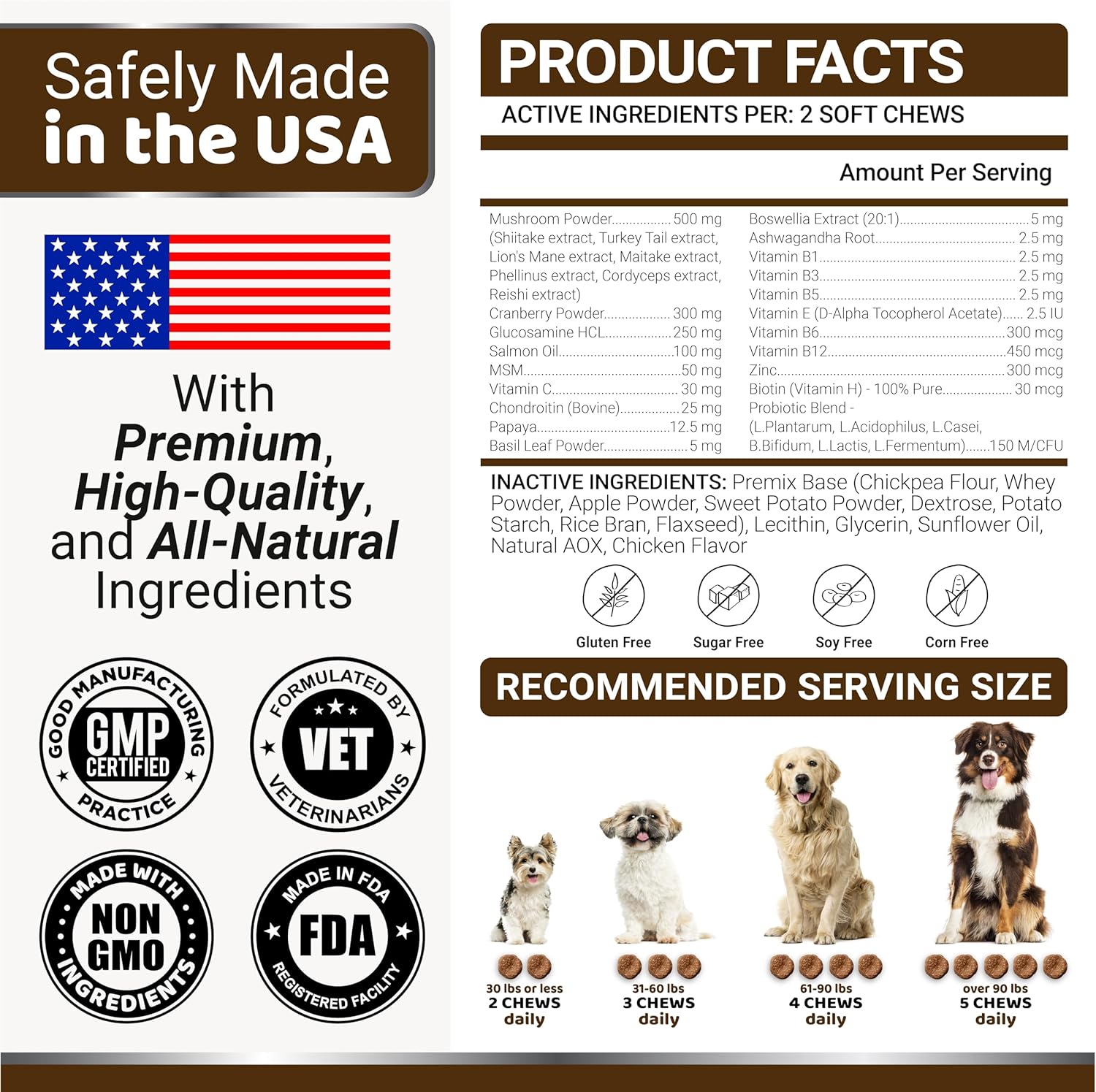 About this item Immune & Overall Health Support for Dogs: Packed with Turkey Tail, Reishi, Lion’s Mane, and Shiitake, this mushroom supplement for dogs supports a strong immune system, gut health, and daily vitality. Joint, Skin & Digestive Care: Our dog mushroom supplements help maintain healthy joints, shiny coat, and smooth digestion, keeping dogs active, energetic, and feeling their best every day. Cognitive Function & Natural Energy: Turkey tail for dogs supports brain health, mental alertness, and natural energy, helping your dog stay playful, focused, and happy throughout the day. Veterinarian Formulated & USA Made: Carefully crafted by veterinarians in the USA, our mushroom complex for dogs combines premium, natural ingredients to deliver safe, effective daily support. Formulated for All Dogs & Sizes: Designed for dogs of all breeds, ages, and sizes, our premium pet mushroom chews are perfect for playful puppies, adult dogs, and senior companions. › See more product details