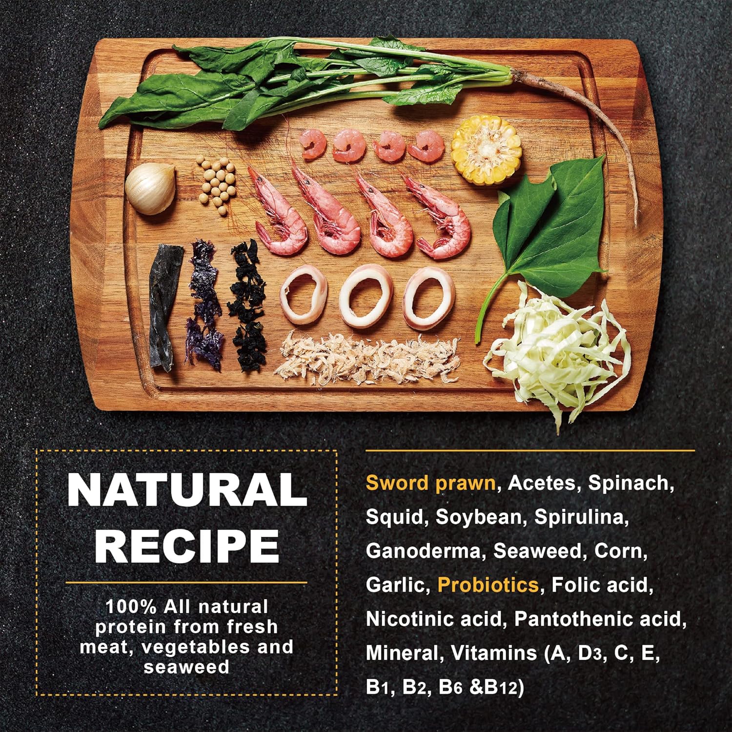 About this item High Palatability : Sword Prawn Flavor - A blend of wild sword prawns, akiami paste shrimp, vegetables and seaweed. A perfect 8:2 meat/vegetable protein ratio even the pickiest betta can’t resist Superior Quality Ingredient : All natural protein from fresh meat, vegetables and seaweed. No additives, no artificial flavors or coloring, no byproducts and other harmful ingredients. Made from carefully selected ingredients like Sword prawns, akiami paste shrimps organic spinach, fresh squid, fresh-pick garlic, natural spirulina and seaweed Healthy Growth Formula : Rich in calcium and vitamin D. It's not only tasty but also keeps fishes healthy! Jam-packed with a variety of vitamins (A, C, D3, E, B1, B2, B6, B12) great for betta’s growth, keeping color vibrance and boost immunity Easy to Intake & Digest : 1.5mm Granule, the right granule size for adult betta fishes to consume, safer and easier to digest. *Feed 1-3 times per day, no more than your fish can consume within 3 minutes 3 Million CFUs/g Probiotics : 3 million CFUs/g probiotics are within the food to help dissolve fish excrements, residuals and keeps water clean. Probiotics also increase the feed conversion rate, improve betta’s immune system and gut health › See more product details