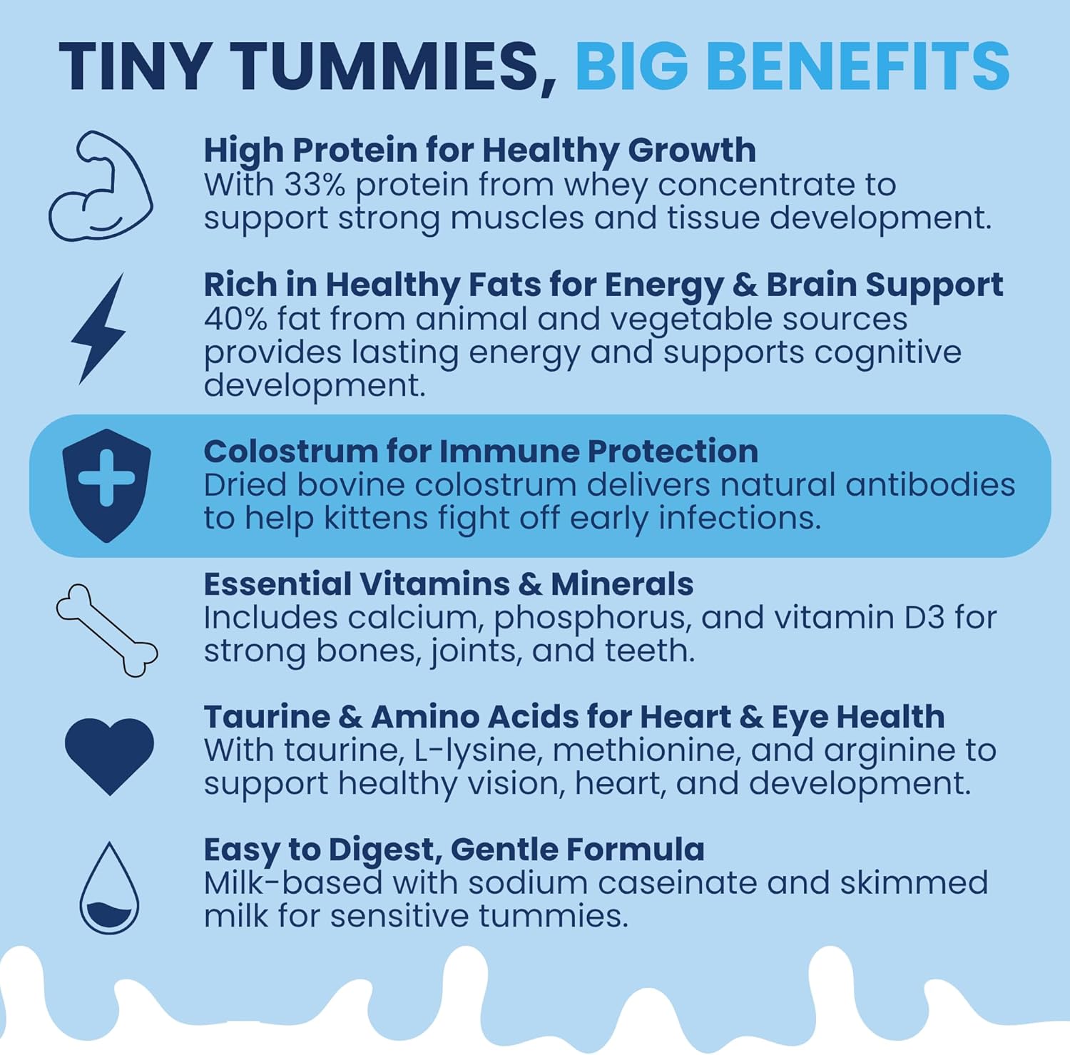 About this item Complete Mother’s Milk Substitute: This nourishing kitten milk replacer is scientifically formulated to mimic the nutritional profile of a mother cat’s milk. A trusted choice for orphaned, underweight, or nursing-challenged kittens needing full-spectrum support. Colostrum for Early Immune Support: Fortified with bovine colostrum, this gentle formula delivers vital antibodies to help young immune systems build strength and resilience. A comforting, protective start for your growing feline. Formulated for Sensitive Digestion: Easily digestible milk proteins, gentle fats, and tailored nutrients support delicate tummies and help prevent digestive discomfort. Ideal for kittens and cats with dietary sensitivities. Adaptable Nutrition for Every Age: From bottle-feeding newborns to nourishing pregnant or senior cats, this kitten formula serves as a complete meal, treat, or supplement. Flexible feeding to support your cat at any stage. Vet-Formulated & MFD in USA: Developed by veterinarians, this high-fat, high-protein formula includes taurine, vitamins A, D3, and B12 to fuel development and vitality. Trustworthy nutrition your pet deserves. › See more product details