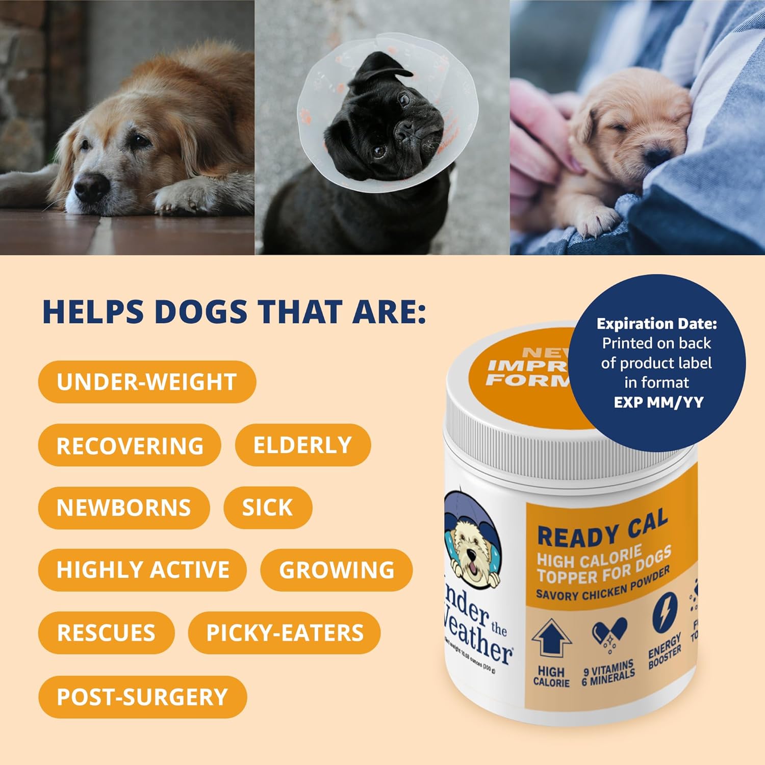 About this item "BOOSTS HEALTHY WEIGHT GAIN: Provides 40 calories per scoop with essential nutrients to help dogs regain weight quickly and prevent further weight loss. Perfect for underweight dogs, seniors, or those recovering from illness or stress with only 1-2 scoops per day. Shelf life: 24 months from manufacturing date. EXP date printed on back of product label as EXP MM/YY." STIMULATES APPETITE: Encourages eating in dogs with poor appetites caused by illness, age, stress, or medical recovery. This nutritional supplement helps restore appetite, ensuring your pup gets the daily calories and nutrition needed to stay strong and healthy. ENERGY-BOSSTING FORMULA: Packed with 9 essential vitamins, 6 minerals, carbohydrates and omega fatty acids to restore energy, strengthen immunity, and keep your dog active, playful, and healthy. IRRESISTIBLE & EASY TO USE: A highly palatable, easy to use new formula powder featuring a savory chicken flavor dogs love. Just sprinkle it over your petβs food or mix it with warm water to create a flavorful gravy. THE BEST FOR YOUR DOG - Ready Cal Powder for Dogs is vet-formulated to provide the essential calories your dog needs daily to gain or maintain a healthy weight. With a savory rotisserie chicken flavor dogs love to promote weight gain. Proudly manufactured in the USA without artificial flavors or dyes. βΊ See more product details