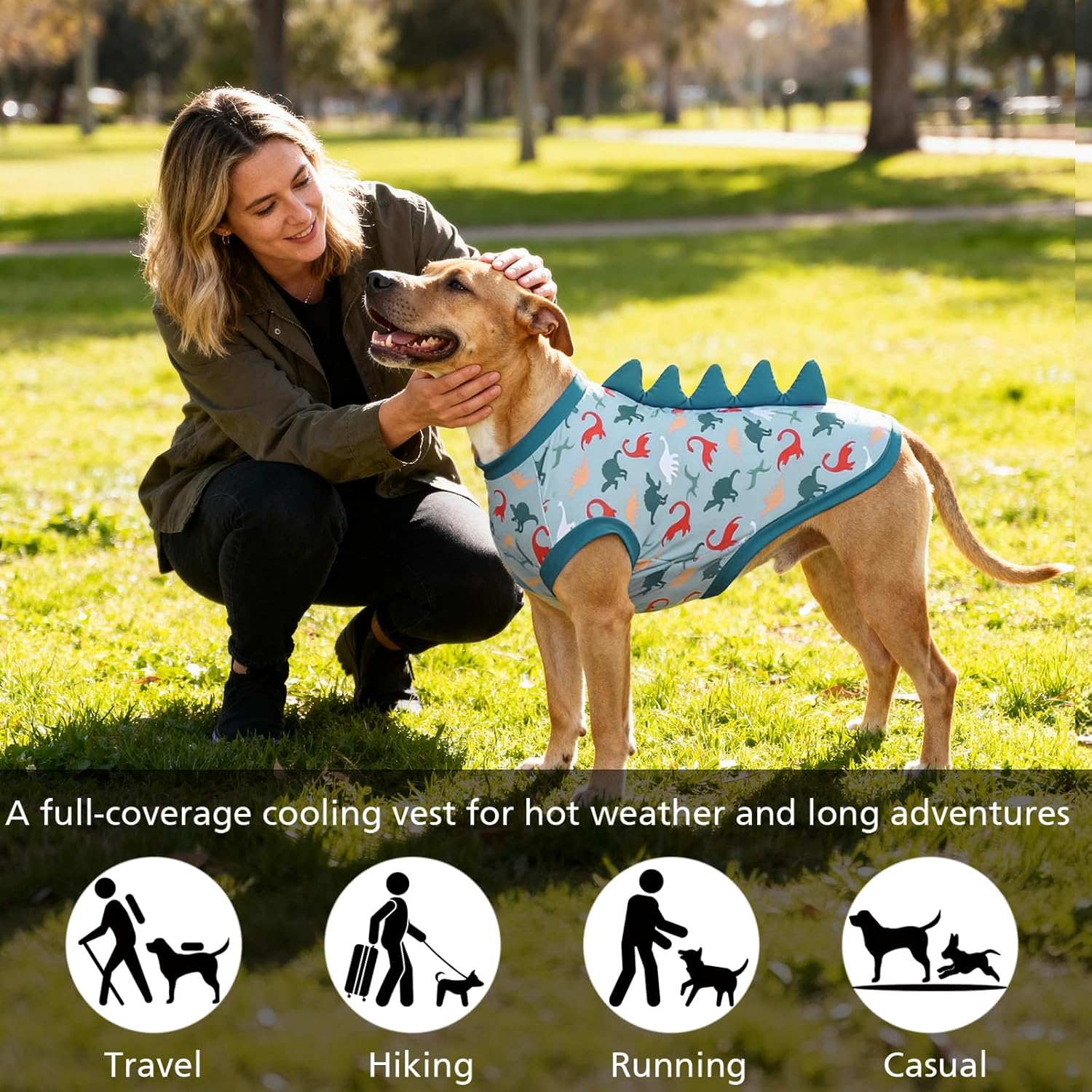 About this item DOG SHIRT for LARGE DOGS : Available in 4 sizes from M to 2XL which can fit different sizes of medium large dogs. You can select the appropriate size according to the priority order of chest > neck > weight >back. Pawfect for strong, active breeds like Pit Bulls, Golden Retrievers, Dobermans, and Labradors. If your dog is between two sizes, we suggest the larger one. SUN PROTECTION DOG SUN SHIRT:Protect your dog from the sun with this SPF 50 UV-blocking t-shirt—ideal for Dogs with sensitive skin. Protect your pet from harmful rays during outdoor activities, park walks, and beach days this summer! FUNNY DINOSAUR DECORATION DESIGN - This large dog cooling shirt uses soft cooling material and cute print design. The back is designed with funny dinosaur decoration. It is very suitable for dogs as traveling or party costumes. There is no doubt that your dog will be the most eye-catching. BREATHABLE & QUICK DRY: Made from lightweight, breathable, and stretchy fabric, this sun protection dog t shirt ensures maximum comfort and freedom of movement while keeping your pet cool—its quick-drying, cooling material is perfect for hot weather play and water activities. KEEPS DIRT & ALLERGENS AWAY: Shields your dog from dirt, allergens, and grime while keeping them clean and comfortable—this durable, easy-wash dog sun shirt is a reusable must-have for outdoor adventures. › See more product details