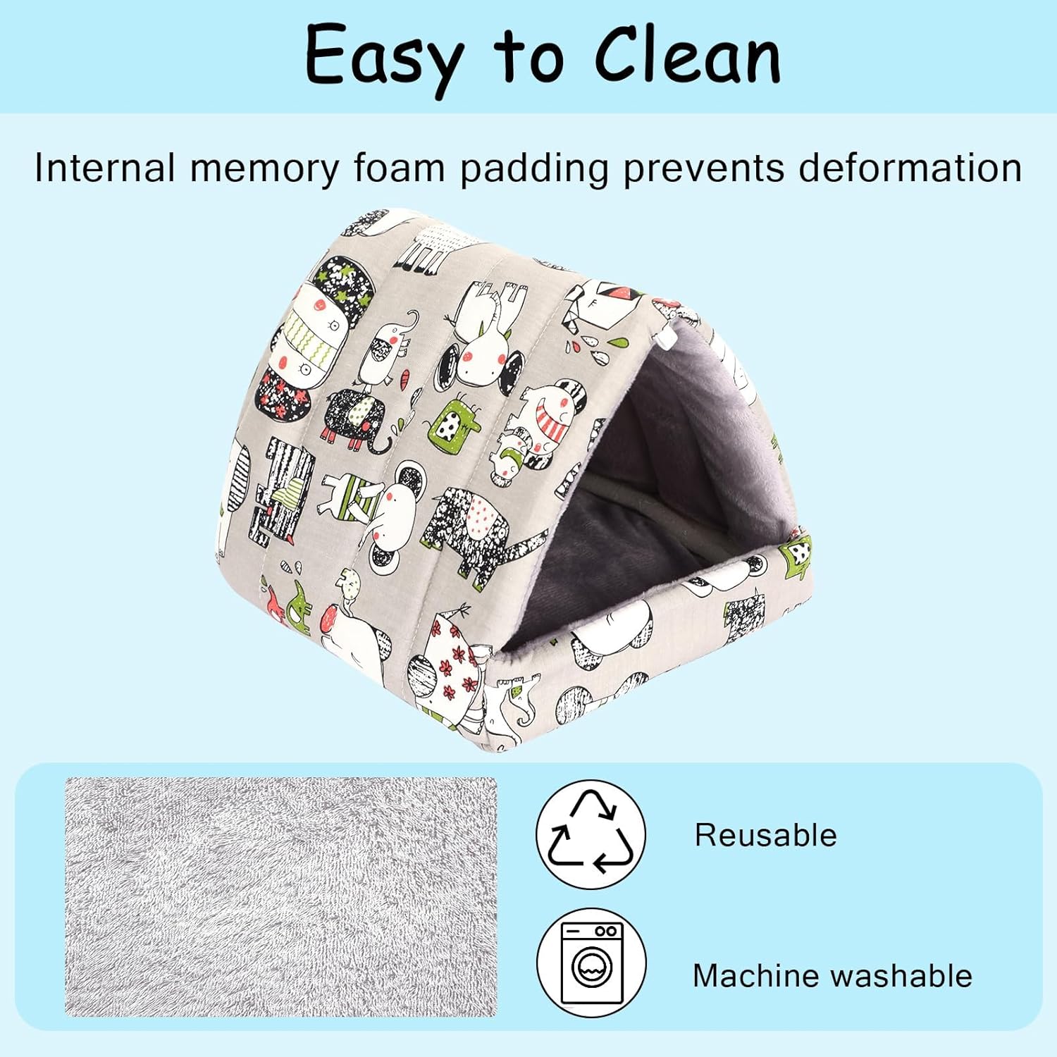 About this item Guinea Pig Cages: The guinea pig hideout with the non-slip bottom ensures hamster nest stays in place. With ultra soft fabric, your furry children will feel comfortable and warm in the small Guinea pig bed. Suitable for small animals such as hamsters, rats, chinchillas, ferrets, Guinea pigs, dwarf rabbits, etc Machine Washable: These Guinea pig bed house is machine washable,the fleece hideout is made of good-quality fabric, making the Guinea pig hidey easy to clean. And the internal PP cotton filling ensures that the Guinea pig bed can remain upright even after multiple washes Multi Functional: The hamster houses can be used as a sleeping bed, and your pet will feel safe and secure when sleeping at Guinea pig hidey.Fleece hideout can also be used as a hiding place for cages, or to place your pet on the legs Sufficient Size: About 7.4 inches long x 6.8 inches wide, very suitable for small animals such as Guinea pigs, hamsters, rats, chinchillas, ferrets, dwarf rabbits, etc. Please remember to measure the size specifications to avoid any size issues Friendly Design: Adopting grey and dark blue, the mouse house is not easy to get dirty,very practical to use, with bright and beautiful patterns. The integrated design avoids accessories from slipping out and can also protect the claws of small animals from being caught. The thickened inner cushion makes the Guinea pig bed stand upright and not easily deformed › See more product details
