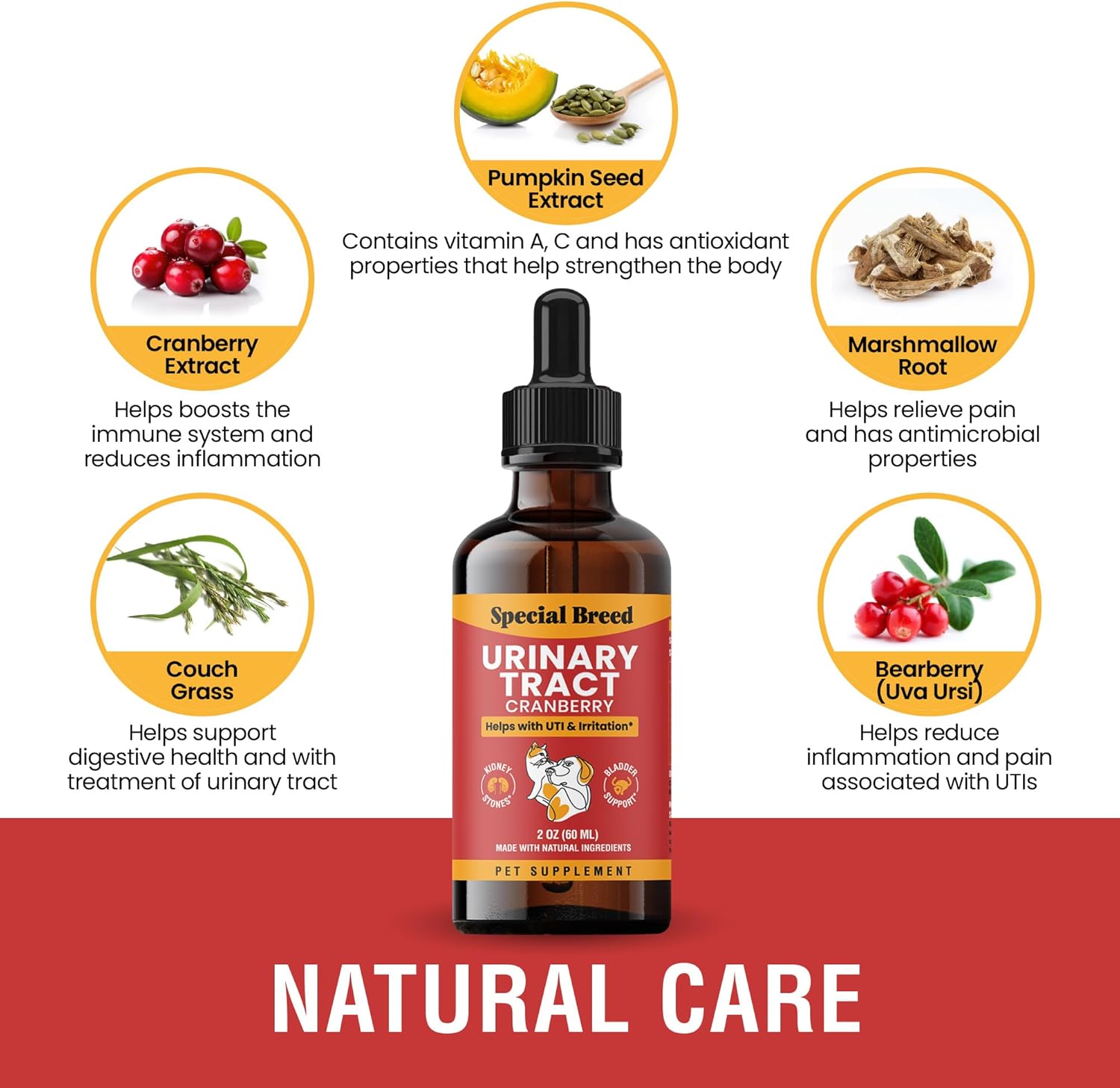 About this item Your Pet Is Priority #1: We know pets can be picky with liquid supplements, and we stand by our product no questions ask. If your pet doesn't love this or you don't see results, we want to hear from you. Natural Formula: Special Breed Urinary Tract Infection Treatment for Dogs and Cats is made with natural ingredients to support your pet's urinary health. High Quality: Our UTI support supplement ensures premium quality, providing effective kidney and bladder support for your pets. Cranberry Supplement: Contains cranberry, known for its benefits in helping to maintain a healthy urinary tract in dogs and cats. USA Made: Proudly manufactured in the USA, ensuring strict quality control and safety standards. βΊ See more product details