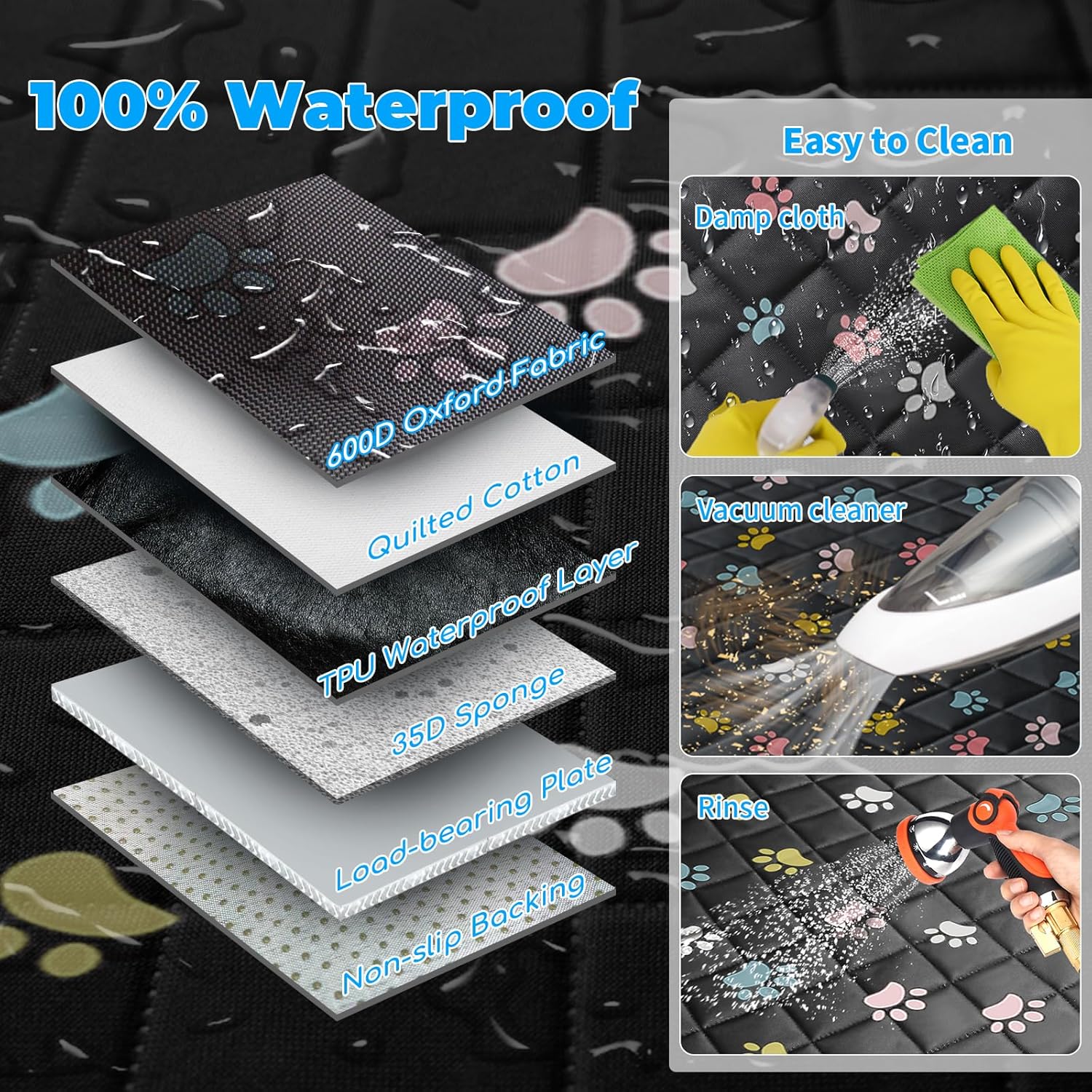 About this item Back Seat Turns into Dog Car Bed: Built-in 3 reinforced load-bearing plates, the hard bottom dog car seat cover turns the backseat into a secure dog car bed. The dog back seat extender increases 40% safe space and supports up to 400lbs, sturdy enough for 2 large breed dogs to stretch or lay comfortably during long car rides. Ideal for families with large dogs, elderly dogs, or multiple dogs Ultimate Comfort: Equipped with 8-layer protection including a layer of 35D sponge, this hard bottom dog seat cover delivers excellent comfort for pets during long rides. Compared to the competitor's single-layer thin board design, our padded hard bottom greatly reduces your dogs' joint pressure, while the non-woven fabric layer ensures durability and effortless removal for deep cleaning of the dog car seat cover Prevent Falls & Easy Care: The dog car hammock with zippered side flaps can keep dogs from falling to the floor, and protect your backseat and car doors from scratches, mud, liquid and hair. The waterproof 600D Oxford material is easy to clean with a damp cloth or vacuum No Smell Material: The dog car seat cover for back seat without terrible smell is friendly for pets and children. In an enclosed car space, smell-free design is also important to keep you focused and driving safely, but competitors ignore this. The thickened PP hollow board plate is more durable than others' wood base Safety First: You can secure your dog with the included dog seat belt. For the safety and comfort of dogs, the dog car travel bed has upgraded all accessories, including 6-layer thickened hard bottom, heavy duty headrest strap and buckle, and durable zipper. 2 Velcro seatbelt openings, seat anchors, and non-slip backing keep your dogs from slipping With Mesh Window & Pockets: The car back seat protector has a mesh window that allows your pets to see you, relieving their anxiety on the road. You can store pets' toys, treats, and other essentials in the 2 storage pockets Universal Fit & Ready to Use: 52" L x 24.8" W (hard bottom size) fits sedans, mid-size SUVs and mid-size trucks. URPOWER back seat pet cover arrives fully assembled for immediate use, unlike other brands that require a lot of time to assemble. This car seat cover for dogs can be installed within 1 minute › See more product details
