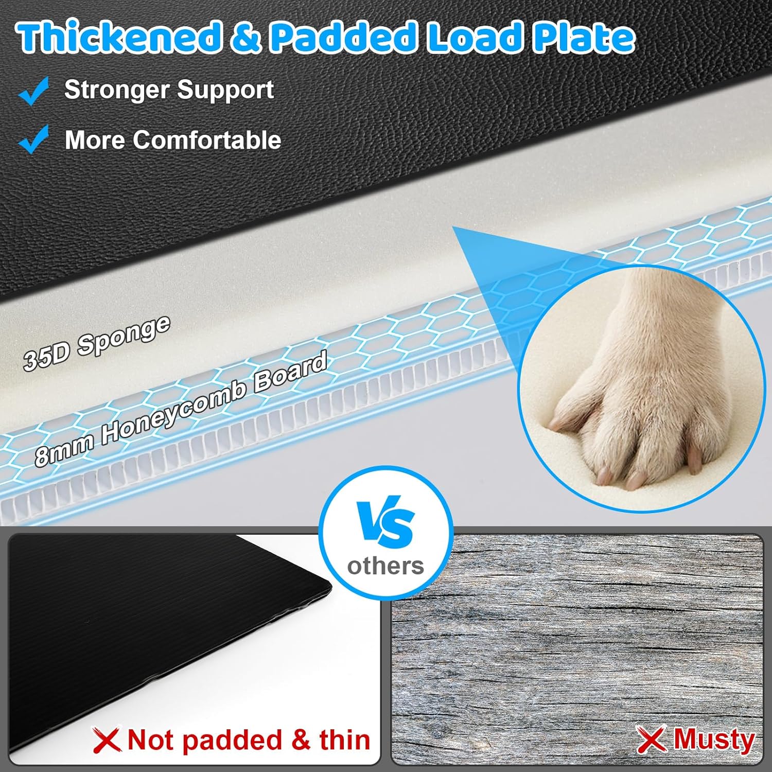 About this item Anti-Scratch & Waterproof PU Leather Material: The back seat extender for dog is made of high-quality leather that can withstand wear and tear, with zippered side flaps, fully protecting your back seat and car doors from scratches. The waterproof surface makes it easy to wipe off dirt, mud, and pet hair Thickened Hard Bottom: The hard bottom dog car seat cover extends the backseat into a sturdy dog car bed, providing your dogs with maximum space and strong support up to 400 lbs. The dog car hammock prevents your dog from falling to the floor, ensuring them stays secure and comfortable during long car rides Ultimate Comfort: The padded hard bottom is built in 7-layer protection. The hard plate is covered with a layer of 35D sponge to enhance comfort, and held in place by premium non-woven fabric, so it's easy to remove for easy cleaning of the dog car seat cover. Plus, the thickened PP hollow board plate is more durable than others' wood base No Smell Material: The dog car seat cover for back seat without terrible smell is friendly for pets and children. In an enclosed car space, no terrible smell is also important to keep you focused and driving safely, something that others' dog covers on the market ignore Safety First: You can secure your dog with the included dog seat belt. For the safety and comfort of dogs, the dog car travel bed has upgraded all accessories, including 7-layer thickened hard bottom, heavy duty headrest strap and buckle, and durable zipper. 2 velcro seatbelt openings, seat anchors, and non-slip backing keep your dogs from slipping With Mesh Window & Pockets: The car back seat protector has a mesh window that allows your pets to see you, relieving their anxiety on the road. You can store pets' toys, treats, and other essentials in the 2 storage pockets Fit Cars, Mid-Size SUVs and Mid-Size Trucks: 52" L x 24.8" W (hard bottom size) fits sedans, mid-size SUVs and mid-size trucks. Easy to clean with a damp cloth or vacuum. The dog back seat extender can be installed within 1 minute › See more product details