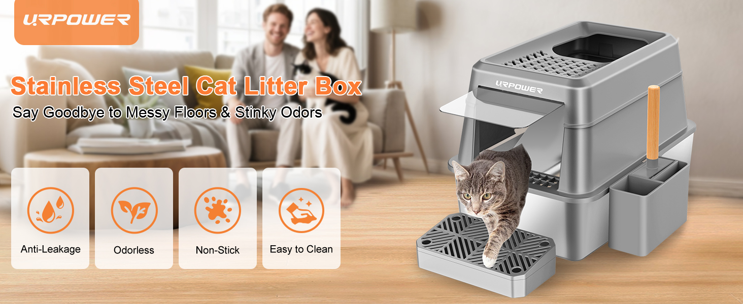 About this item HIGH QUALITY STAINLESS STEEL: Made of premium stainless steel, our stainless steel litter box won't rust or get scratches like the plastic litter box does. And it has a smooth and non-stick surface that is easy to clean without leaving any smell GREAT FOR HIGH PEEING CATS: URPOWER litter box with lid has an enclosed design to ensure a mess-free litter area. Designed for diggers and high-peers to keep the floor clean and dry. Say goodbye to scattered litter and urine spills EXTRA LARGE CAPACITY:The XL cat litter box is perfect for large cats, measuring 23.8x16.5x15.2 inches. It provides roomy space for cats to comfortably move around and can hold up to 26 liters of cat litter, sufficient for an adult cat for 30 days FULLY ENCLOSED AND SEMI-ENCLOSED: Featuring an easy-to-assemble lid, our metal cat litter box offers both fully enclosed and semi-enclosed configurations. One can provide privacy and prevent the smell from spreading, while another can promote ventilation TRIPLE FILTER PEDAL DESIGN: The top entry litter box has an upgraded filter pedal design on the top entrance, front step and foot pedal. This thoughtful design effectively saves you time and effort in cleaning DUAL ENTRY OPTION: The large cat litter box offers a top entrance and a front entrance with footsteps to meet the needs of all cats with different personalities and physical conditions. The front door and pedal are ideal for short-legged or elderly cats › See more product details