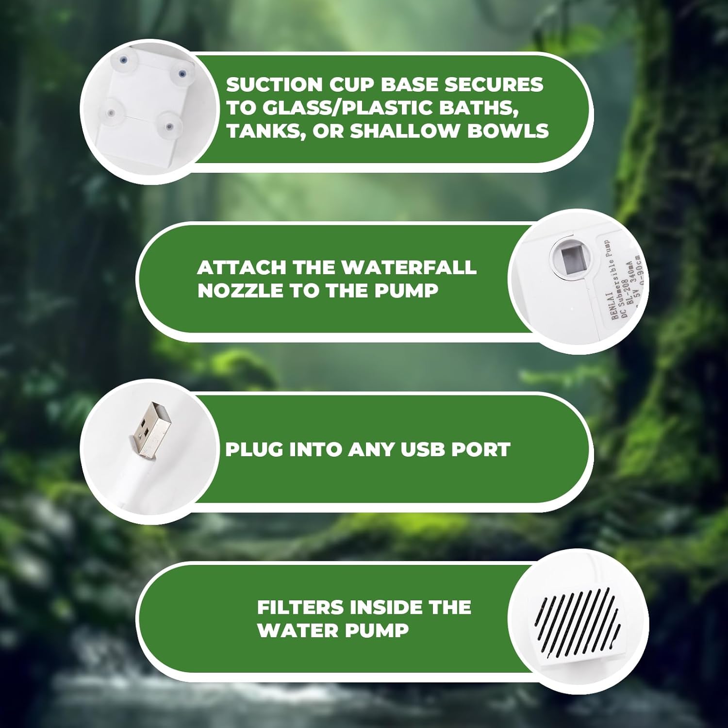 【Gentle Cascading Water Flow】: The USB pump creates a steady waterfall stream (no adjustment needed). Perfect for simulating light rain to encourage natural bathing in bearded dragons, frogs, or tortoises. 【Simple Plug-and-Play Setup】: Submerge the pump in your container. Attach the waterfall nozzle to the pump. Plug into any USB port (adapter not included). Suction cup base secures to glass/plastic baths, tanks, or shallow bowls. 【Safe & Non-Intimidating Design】: Low-flow nozzle prevents overwhelming small pets. Smooth plastic tubing and coral fleece towel (machine-washable) protect delicate skin and scales. 【Hydration & Shedding Support】: Promotes drinking and helps loosen shed skin. Use the towel for post-bath drying or as a cozy burrowing spot in habitats. 【Compact & Multi-Use】: Ideal for bearded dragons, tree frogs, and juvenile turtles. Pump fits containers with smooth surface. › See more product details