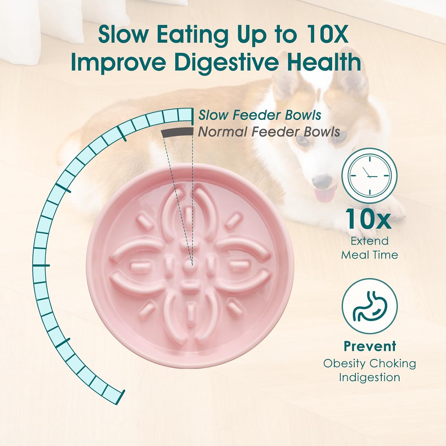 About this item 【Ideal for Mid-Size Dogs】 Ideal for middle breeds like Beagles and French Bulldogs, this compact bowl (8.5" diameter x 1.9" height) holds 1.5 cups of food or water. Its shallow design makes it easy for middle dogs to access their meals comfortably while keeping portions controlled. 【Elegant & Functional Design】 This beautifully crafted ceramic dog bowl features a stunning floral pattern with a raised flower centerpiece—not just for aesthetics, but to slow down your dog’s eating by up to 10x compared to regular bowls! 【Promotes Healthy Eating Habits】 Helps prevent bloat, choking, indigestion, and obesity by encouraging slower, safer mealtime pacing. Perfect for fast eaters! 【Premium Ceramic Construction】 Made from high-quality, non-toxic ceramic for a sturdy, pet-safe feeding solution—easy to clean, and retains a smooth, glossy finish even after repeated use. 【Secure Anti-Slip Base】 Includes non-slip adhesive pads that stick firmly to the bottom, preventing spills and keeping the bowl steady—even for energetic eaters! 【Dedicated After-Sales Support】Our professional customer service team ensures quality assurance and prompt assistance for any concerns. › See more product details