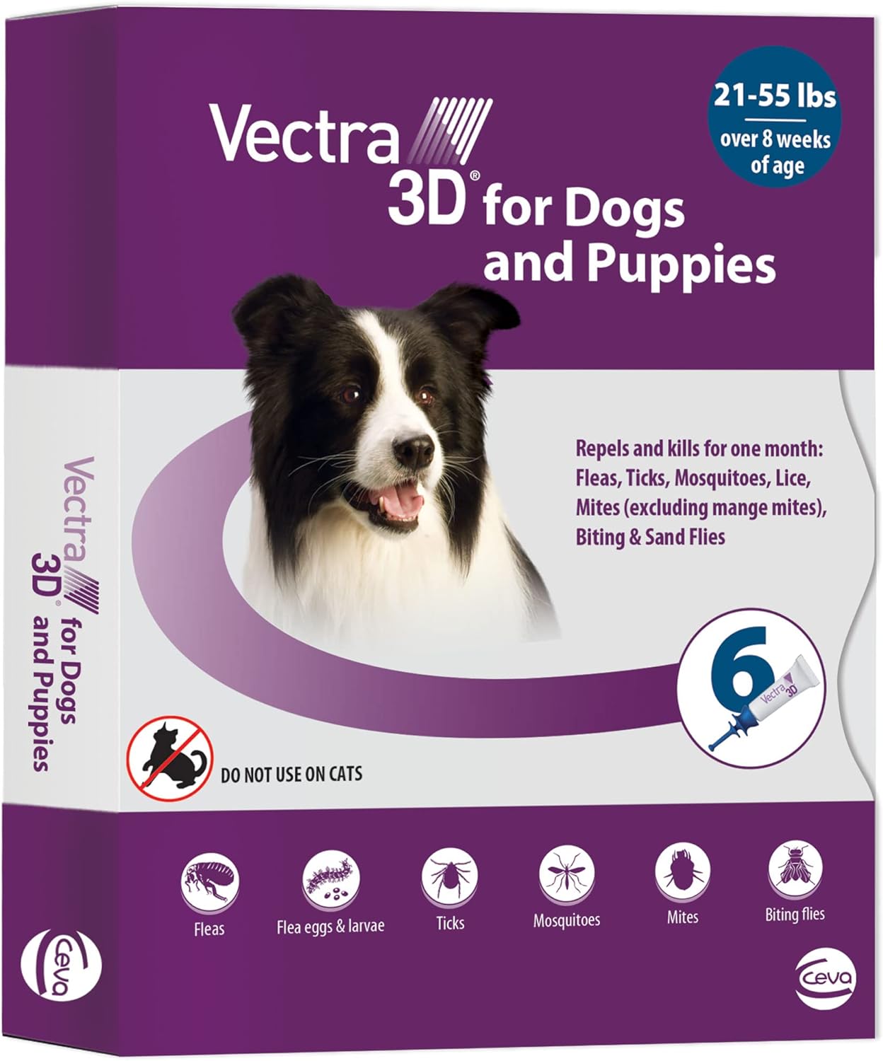 About this item Trusted for 15 years, Vectra 3D Medium Dog Monthly Treatment & Prevention protects dogs 21 to 55 lbs. and 8 weeks of age or older from fleas, ticks, mosquitoes, lice, mites (excluding mange mites), and biting and sand flies Begins reducing flea feeding (bites) in 5 minutes. Kills fleas in 4 hours. Repels and kills fleas, ticks and mosquitoes, no bite required Easy-to-apply topical treatment that is quick drying, fragrance-free, non-greasy and waterproof after 24 hours No prescription required › See more product details