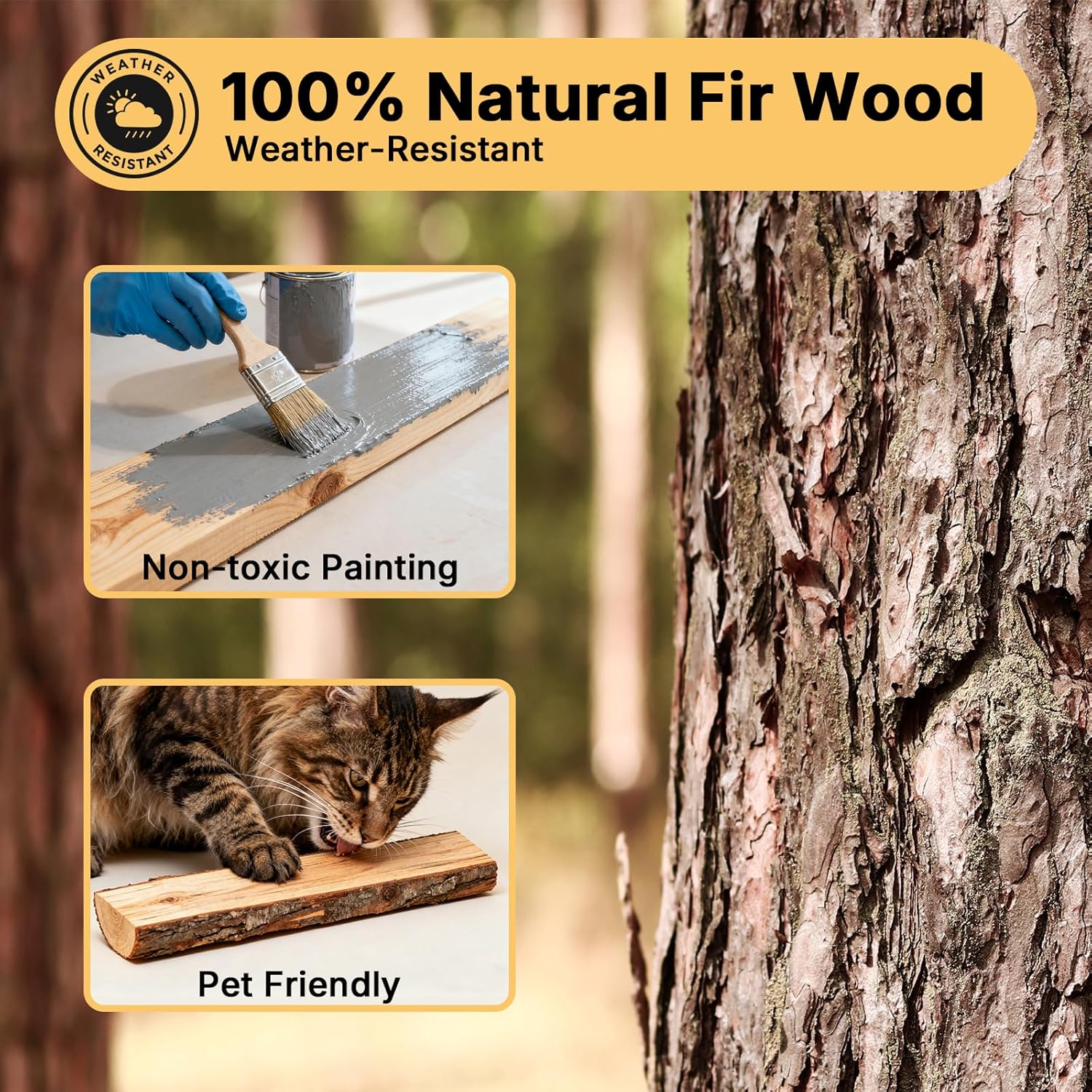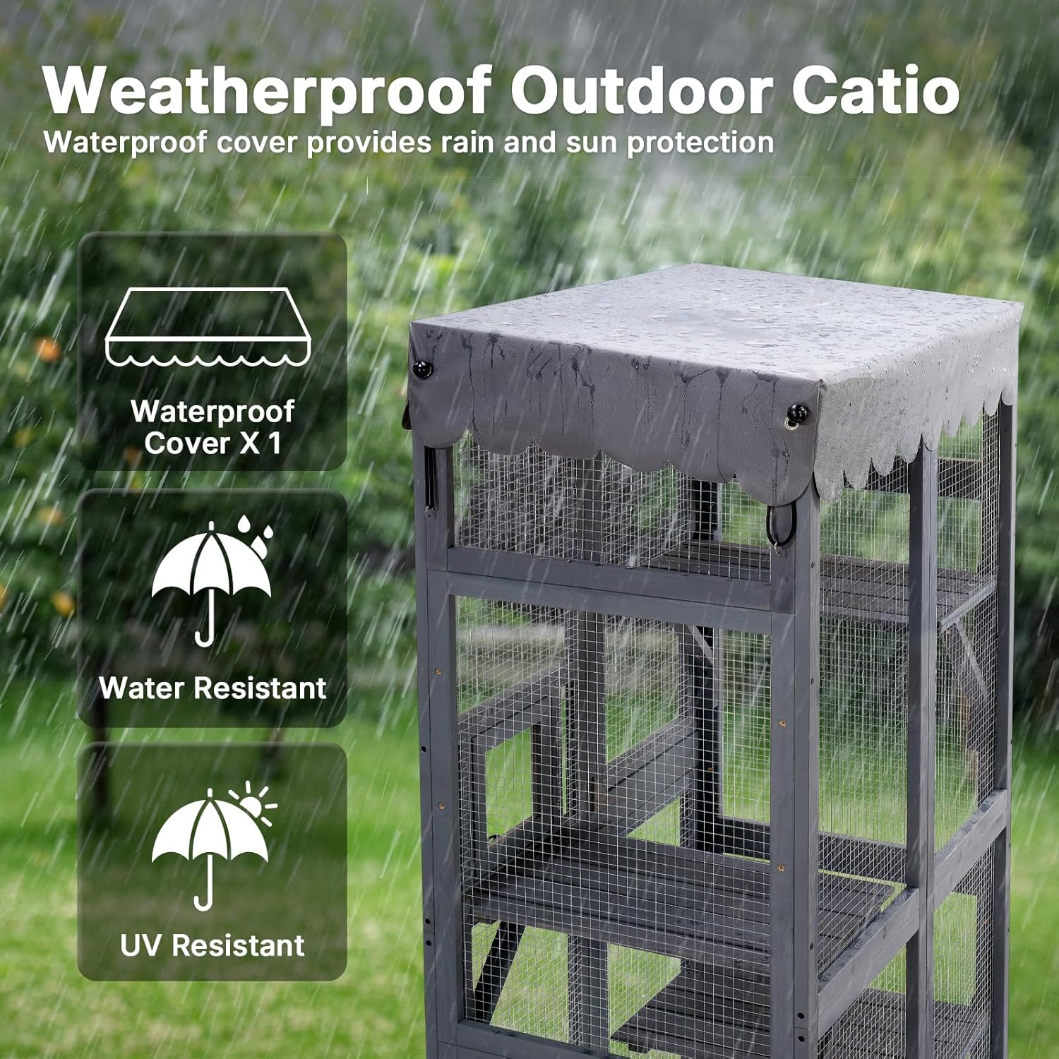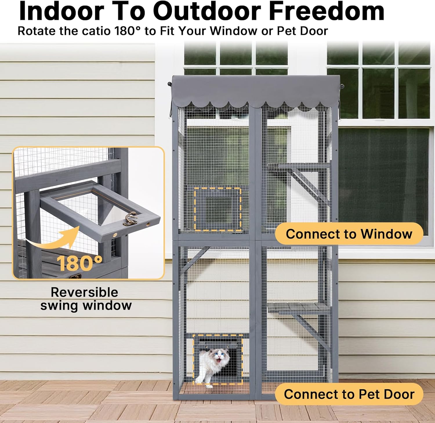About this item Seamless Indoor-Outdoor Access: Connect this catio directly to your home! A reversible swing door links to your window or pet door, creating a safe pathway for your cat to move freely between your house and the outdoor cat enclosure Multi-Level Feline Playground: This catio features 3 spacious, paw-safe wooden platforms. The multi-level design encourages natural climbing instincts, providing the perfect spot for your cat to play, lounge, and observe the world in a fun, stimulating environment Weather-Resistant Outdoor Catio: Keep your cat comfy in any season. The weatherproof roof on this outdoor cat enclosure shields them from harsh sun and light rain, ensuring a safe and dry space for year-round enjoyment and extending the life of the catio Spacious & Comfortable Design: Measures 31.5"L x 20.5"W x 63.0"H, this catio easily accommodates 2-3 cats. With three large platforms, it offers plenty of room for your pets to lounge, nap, and sunbathe without ever feeling cramped Durable & Secure: Cafted from premium, natural fir wood, this cat outdoor enclosure is made to last. The sturdy construction helps keep unwanted predators out, ensuring your cat is always safe and secure in their patio › See more product details
