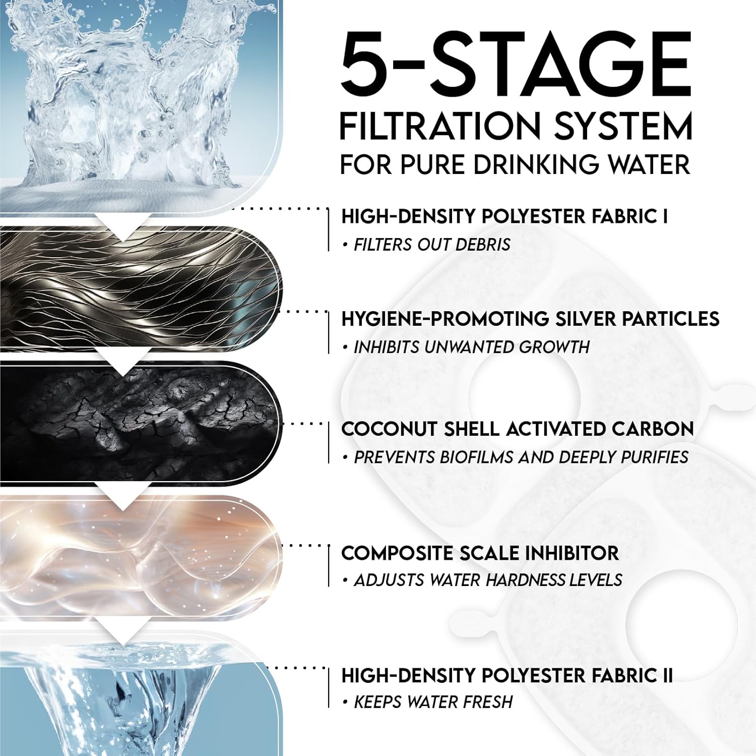 - Included Components: 1 x Adapter (100-120V), 1 x DC Pump (with a 6ft power cord), 1 x Pet Water Fountain(8.3 x 8.3 x 4.9in), 1 x Silicone Mat, 6 x Pre-filter Sponges, 6 x Filters