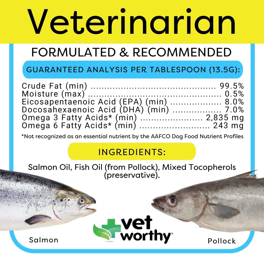 About this item Supports Normal Shedding: This dog fish oil contains fish and salmon sourced from the Alaskan ocean to safely support and maintain healthy skin and coat. Veterinarian Formulated: This salmon flavored oil for dogs from Vet Worthy offers premium and safe ingredients that are good for your dogs. It contains Omega 3-Fatty Acids to support dog’s skin and coat health. Safe and Effective: This salmon oil blend for dogs from Vet Worthy is safe and effective, made of salmon and fish oil to keep your dogs safe and healthy. The salmon and fish are from the fresh Alaskan oceans. Ideal for all dogs breeds and ages Easy to Use: Add this delicious Salmon Oil on your dogs’ food as topping. A Salmon flavored oil ideal for all dog breeds and ages, especially those who need skin and coat support. Quality Made: Vet Worthy is an American Company that offers a wide variety of products that are proudly made under strict quality control to provide healthy benefits for furry friends.. Because a Healthy Pet is a Happy Pet › See more product details