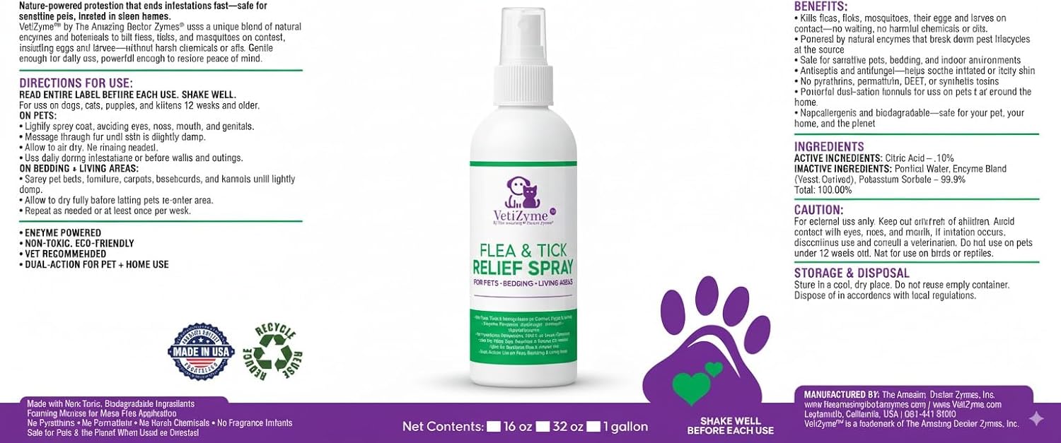 VetiZyme Flea & Tick Relief Spray is the safe, natural alternative to chemical flea and tick treatments. Designed for dogs, cats, and small animals, it controls pests while protecting pets and their environments. Powered by enzyme technology, VetiZyme targets fleas, ticks, and their eggs—breaking down infestations at the source without harmful pesticides. It can be sprayed directly on pets, bedding, kennels, or living areas for all-around protection. ✅ Enzyme Action: Breaks down fleas, ticks & eggs naturally ✅ Safe & Non-Toxic: Biodegradable, chemical-free, pet & family safe ✅ Multi-Use: Spray on pets, bedding, furniture, kennels & homes ✅ Professional Strength: Trusted by vets, groomers, shelters & boarding facilities ✅ Eco-Friendly: Protects pets & planet without chemical residues With VetiZyme Flea & Tick Relief Spray, you can safeguard your pets and home with natural, effective pest control you can trust.
