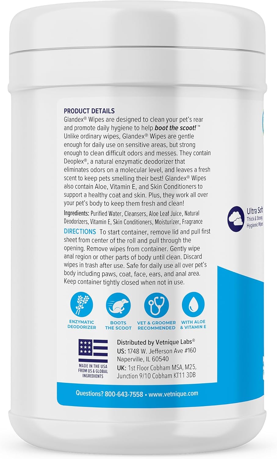Help pets refresh the breath with Dentabliss and boot the scoot with Glandex! Our exclusive bundle offers best-selling pet products plus our newest formula, helping pet parents promote superior pet health every day. Dentabliss cat and dog dental wipes give pet parents a convenient way to tackle bad dog breath while preventing plaque and tartar buildup. Each gentle, 100% cotton dental wipe makes it easy to support teeth and gum health with a dual-action design: a bumpy side with Brushing Beads for scrubbing away plaque and preventing tartar, and a quilted side for polishing. Featuring natural ingredients like Peppermint, Thyme, and Neem for breath-freshening power and soothing gum care. Glandex Anal Gland Support Chews are more than just a dog treat–these vet-recommended chews promote anal gland health with a patented blend of Fiber, Probiotics, Omega Fatty Acids, and Pumpkin for dogs. Glandex is a vet-formulated probiotic for dogs and cats that promotes digestive health and regularity, which can be especially helpful while your pet is on medication or taking pills. Anal gland problems stink, but with Glandex dog wipes cleaning, deodorizing, and refreshing pets’ rear ends is easier for pets and pet parents alike! Natural Deodorizers and a Fresh Scent help erase unpleasant odors and wipe away messes associated with anal gland problems, while calming Aloe Vera makes our wipes extra gentle on delicate skin. Glandex deodorizing pet wipes for cats and dogs are perfect for cleaning the rear end after gland expression or promoting better hygiene and health in the anal area. All Vetnique products are vet-formulated, made in the USA with premium globally sourced ingredients, and contain no artificial preservatives.