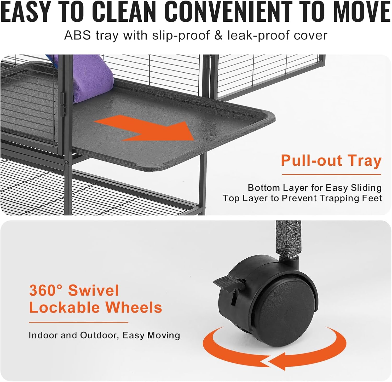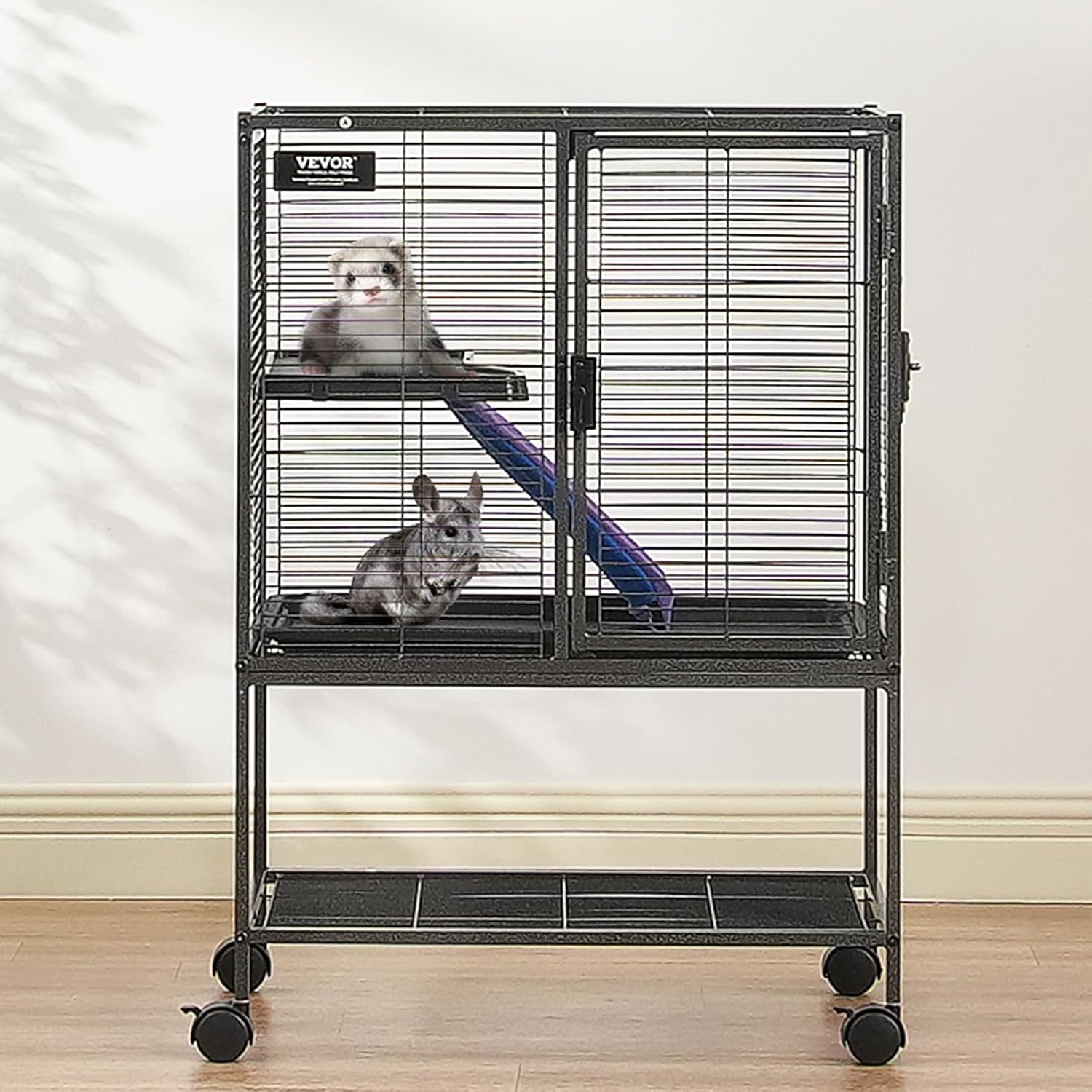 About this item Spacious Living Area: This ferret nation cage provides your pet with a spacious activity area of 24"x17.3"x34.1"/610x440x865 mm. Our ferret cage includes a fabric-covered non-slip ramp to support your pet's play and exercise needs. Get Vevor metal chinchilla cage to get ample space for both living and activities! Sturdy and Practical: This pet cage is reinforced thick metal square tubes ensures great stability and rust resistance thanks to the fine and even powder coating and welding. The small animal cage features narrow 0.55" metal mesh spacing, with screw-in door latches, to prevent small animals from escaping. Easy to Clean: The removable platforms and grids make the small ferret cage cleaning easy. The ABS-coated metal bottom tray fits tightly with the metal mesh to prevent urine leakage and foot injuries, providing a safe environment.Vevor ferret nation cage with the pull-out design and openable front door facilitate quick and convenient cleaning. Convenient Feeding & Playing: With a narrow 0.55" spacing, this critter nation cage is suitable for various small animals including ferrets, chinchillas, guinea pigs, hedgehogs, and small kittens. The dual-layer door with the openable top window enables easy feeding and close interaction with your pets, making feeding simple and enjoyable. Easy to Move and Store: Our metal rolling pet cage comes with lockable rolling wheels, allowing easily move your pets from indoors to outdoors, letting them enjoy sunlight and nature. Additionally, there's a large storage shelf above the wheels for keeping pet supplies organized and saving space. › See more product details