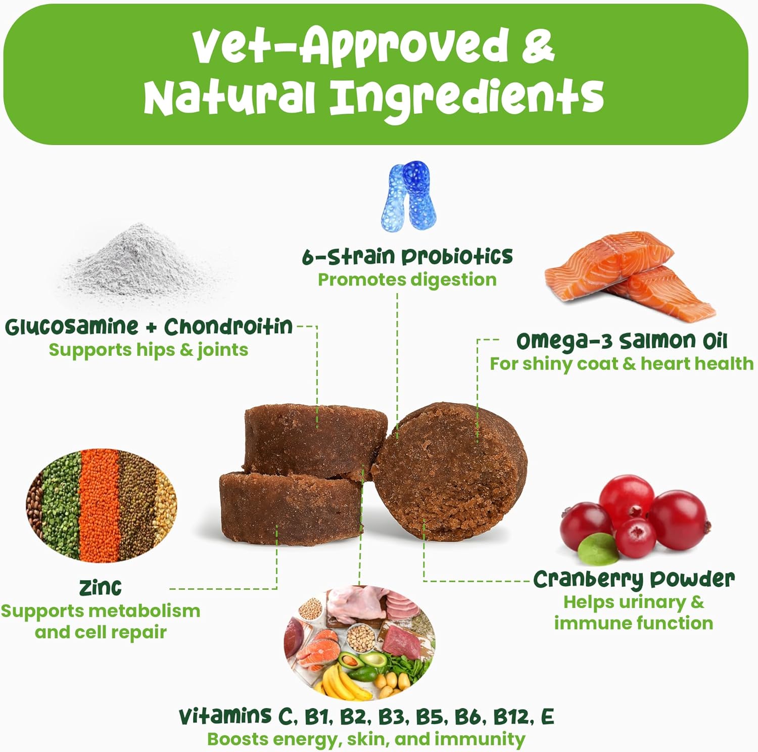 - Active Ingredients: Chondroitin & Glucosamine (supports hips & joints), Probioticts Blend (easier & faster digestion)., Omega-3 Salmon Oil (shiny coat & heart health), Cranberry Powder (helps urinary & immune funtion), Optimal dose of Vitamins (energy, skin & immunity), Zinc (supports metabolism & cell repair)See more